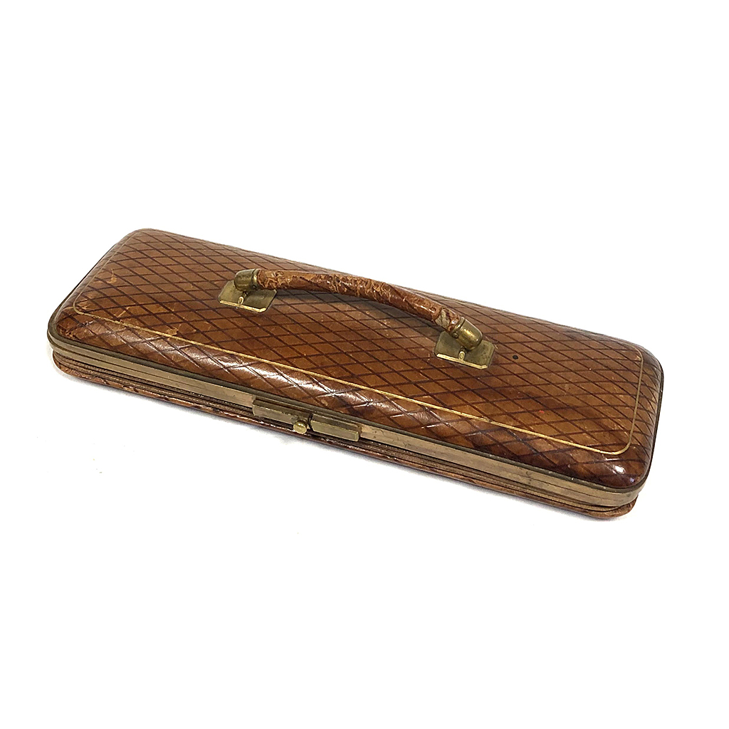 BROWN LEATHER CONCERTINA GLOVE BOX WITH HANDLE 28 CM LONG / 9 CM DEEP