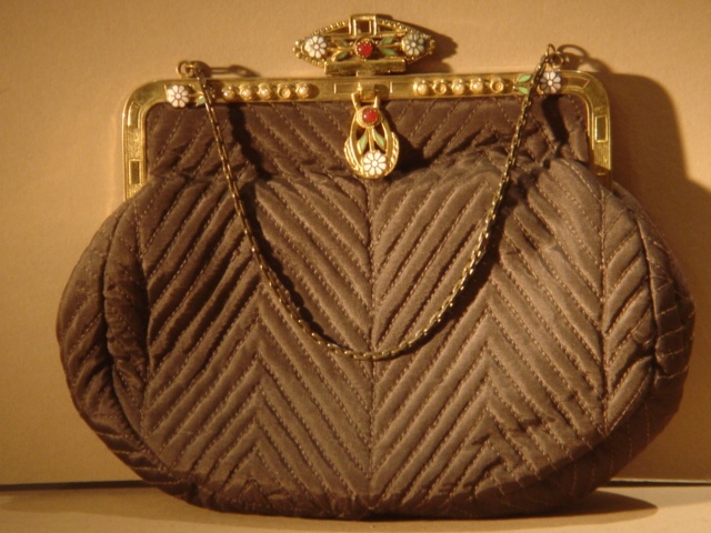 BROWN QUILTED HANDBAG WITH JEWEL ENCRUSTED GILT METAL TOP 20 CM WIDE