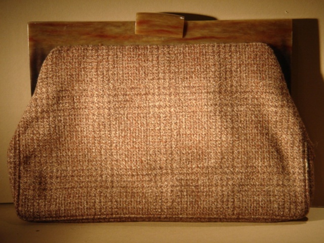 BROWN TWEED CLUTCH HANDBAG WITH A HORN TOP 30 CM WIDE