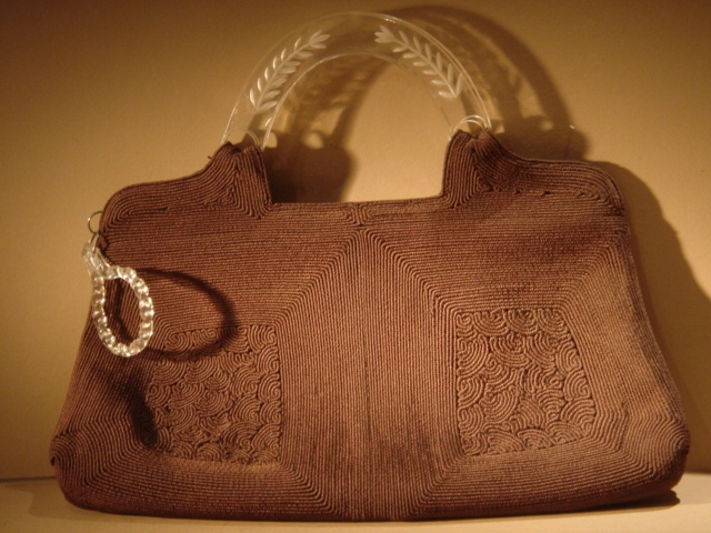 BROWN WOVEN HANDBAG WITH A CUT PERSPEX HANDLE 34 CM WIDE