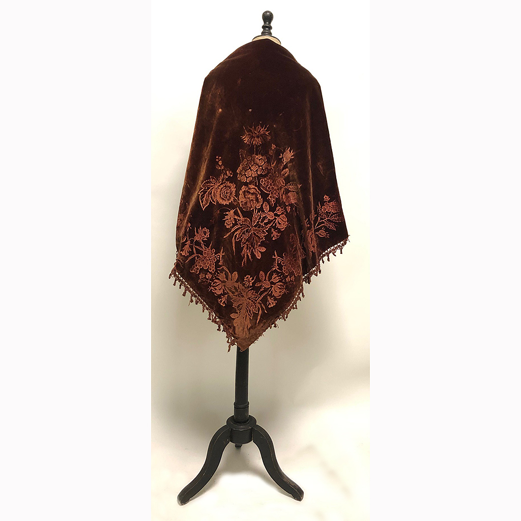 BURGUNDY VELVET TRIANGULAR SHAWL WITH EMBOSSED FLORAL DESIGN