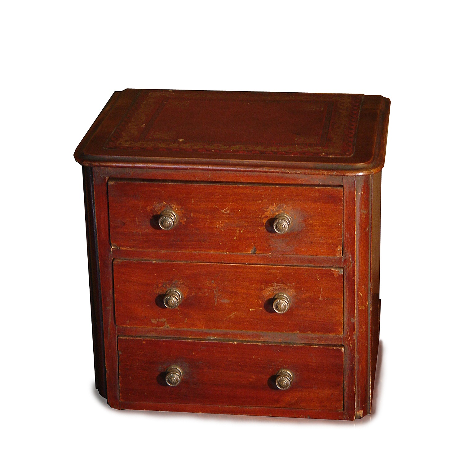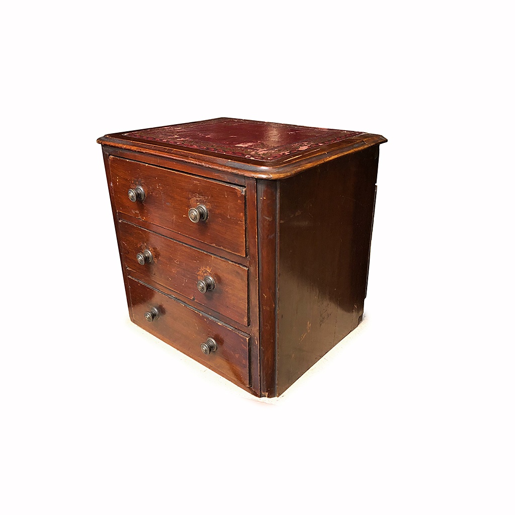 CABINET MAKERS MINIATURE MAHOGANY CHEST OF DRAWERS WITH RED TOOLED LEATHER TOP 23 CM HIGH 26 CM WIDE 21 CM DEEP