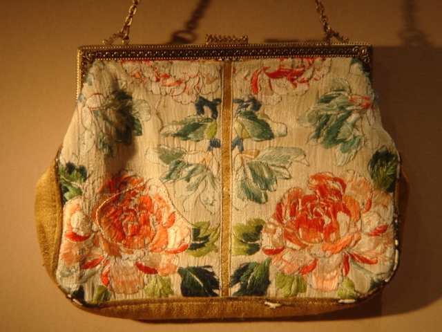 CANTONESE EMBROIDERED HANDBAG WITH GILT METAL TOP AND CHAIN STRAP 20 CM WIDE