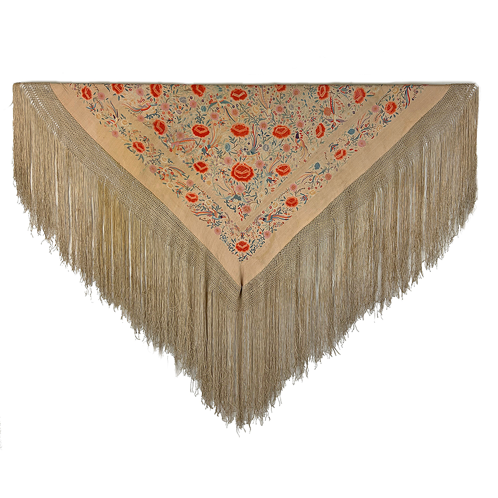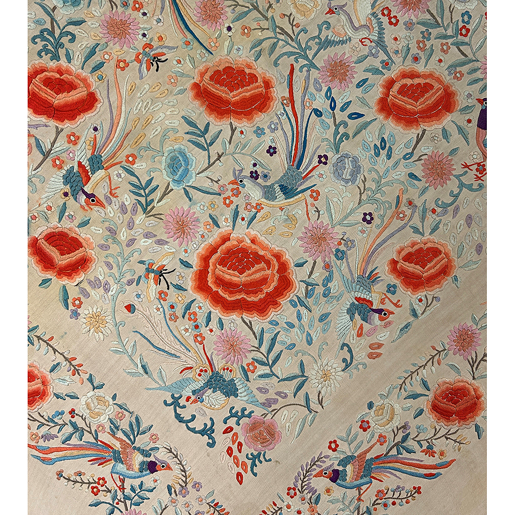 CANTONESE HEAVY SILK SHAWL WITH MULTICOLOURED CORALS AND BLUES SILK EMBROIDERY AND LONG LATTICE FRINGING, FLORAL AND BIRD DESIGN