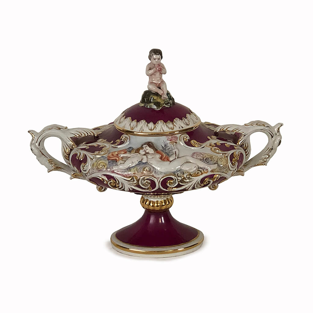 CAPODIAMONTE ITALIAN ORNATE PORCELAIN COVERED URN PURPLE DECORATED WITH CHERUB RELIEF TWIN HANDLES AND CHERUB FINIAL LID 40 CM HIGH