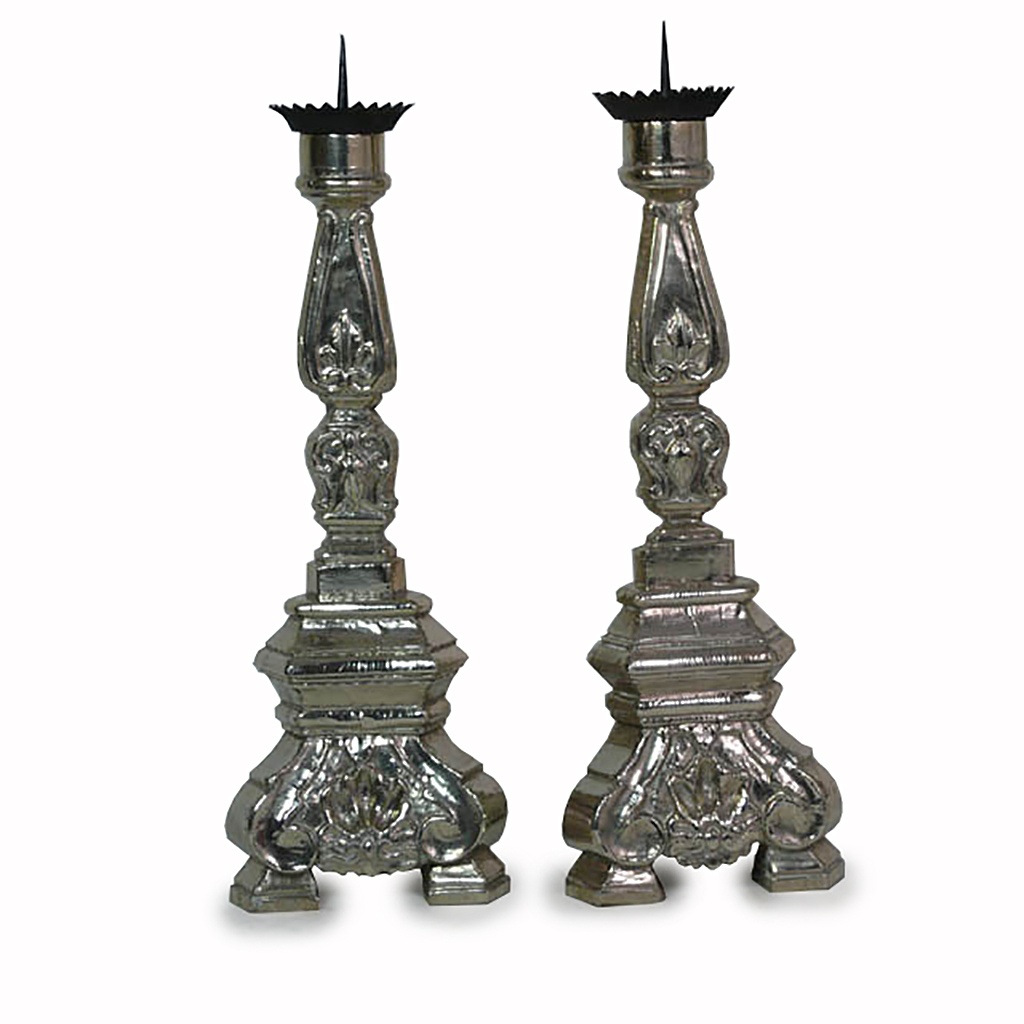 CARVED CANDLESTICK / PRICKET ITALIAN STYLE OVERLAID WITH SILVER METAL TRI CORN BASE 62 CM HIGH