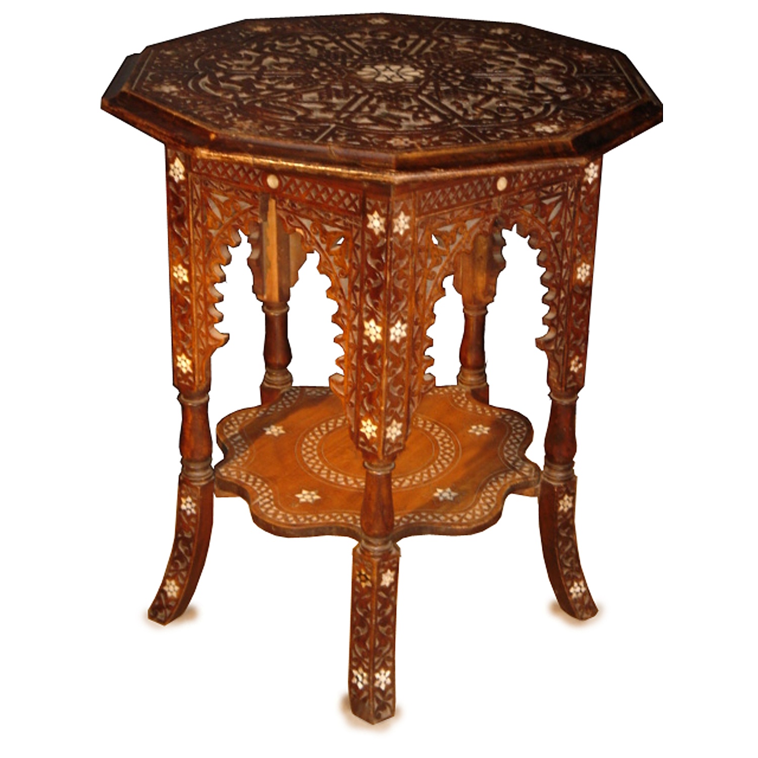 CARVED HEXAGONAL ORIENTAL / MOROCCAN OCCASIONAL TABLE WITH BONE STAR PATTERN INLAY 63 CM HIGH 56 CM WIDE 56 CM DEEP