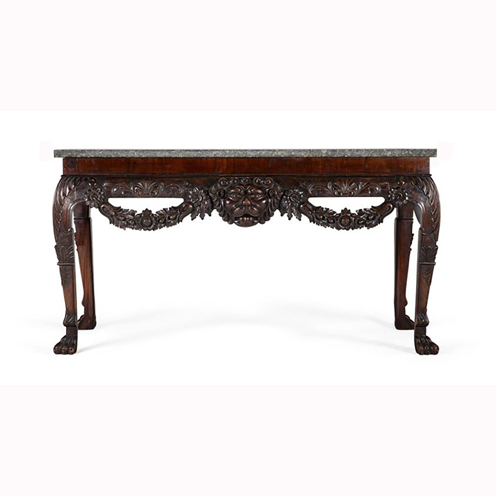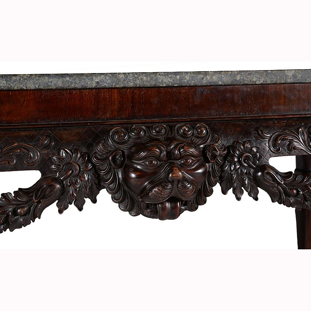 CARVED IRISH MAHOGANY CONSOLE TABLE WITH A GREEN MARBLE TOP LION MASK CENTRE WITH SWAGGED GARLANDS LION PAW FEET 18TH CENT STYLE 79 CM HIGH 147 CM WIDE 72 CM DEEP