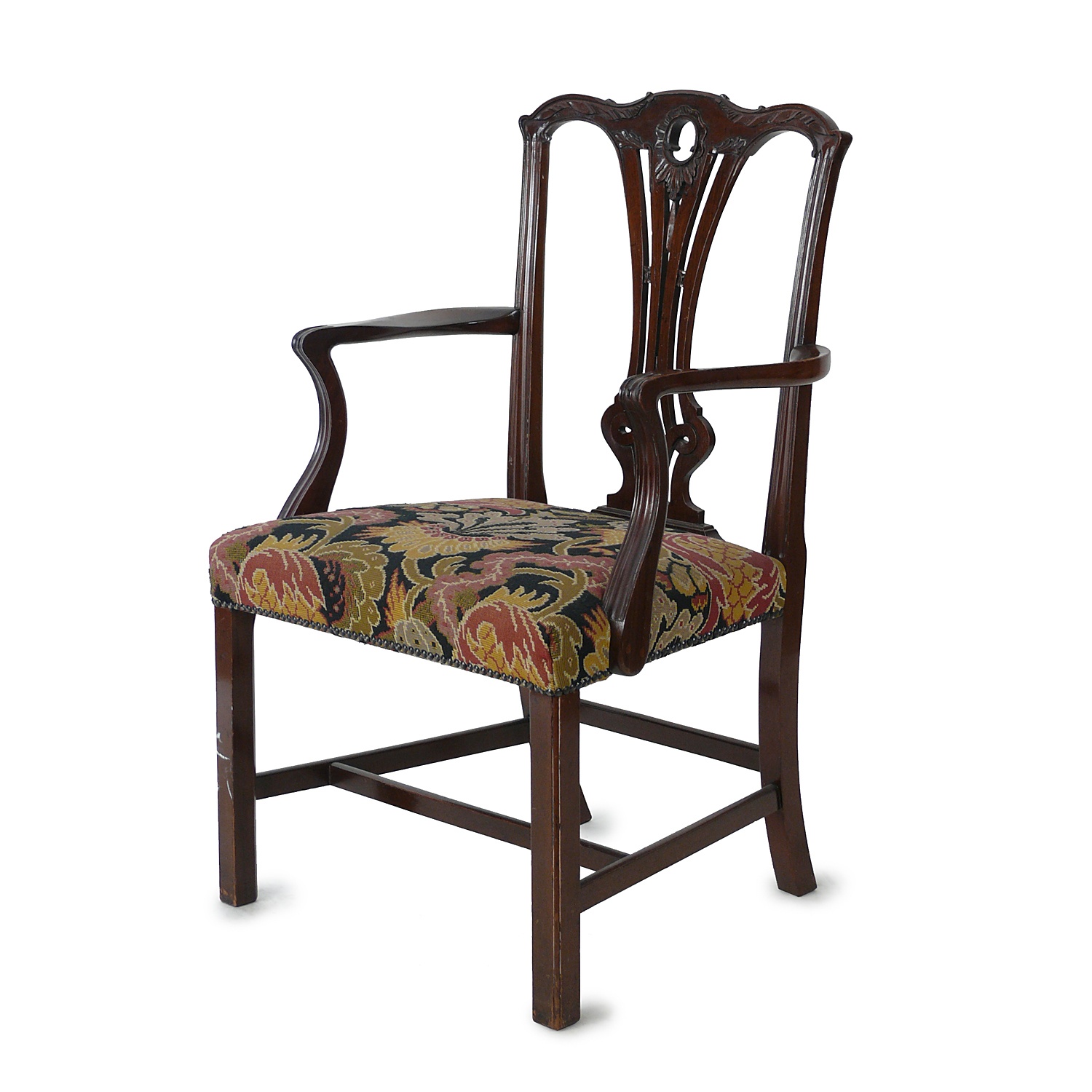 CARVED MAHOGANY CHIPPENDALE STYLE ELBOW CHAIR WITH BROWN GROSS POINT NEEDLEWORK SEAT 98 CM HIGH 60 CM WIDE 56 CM DEEP (X2)
