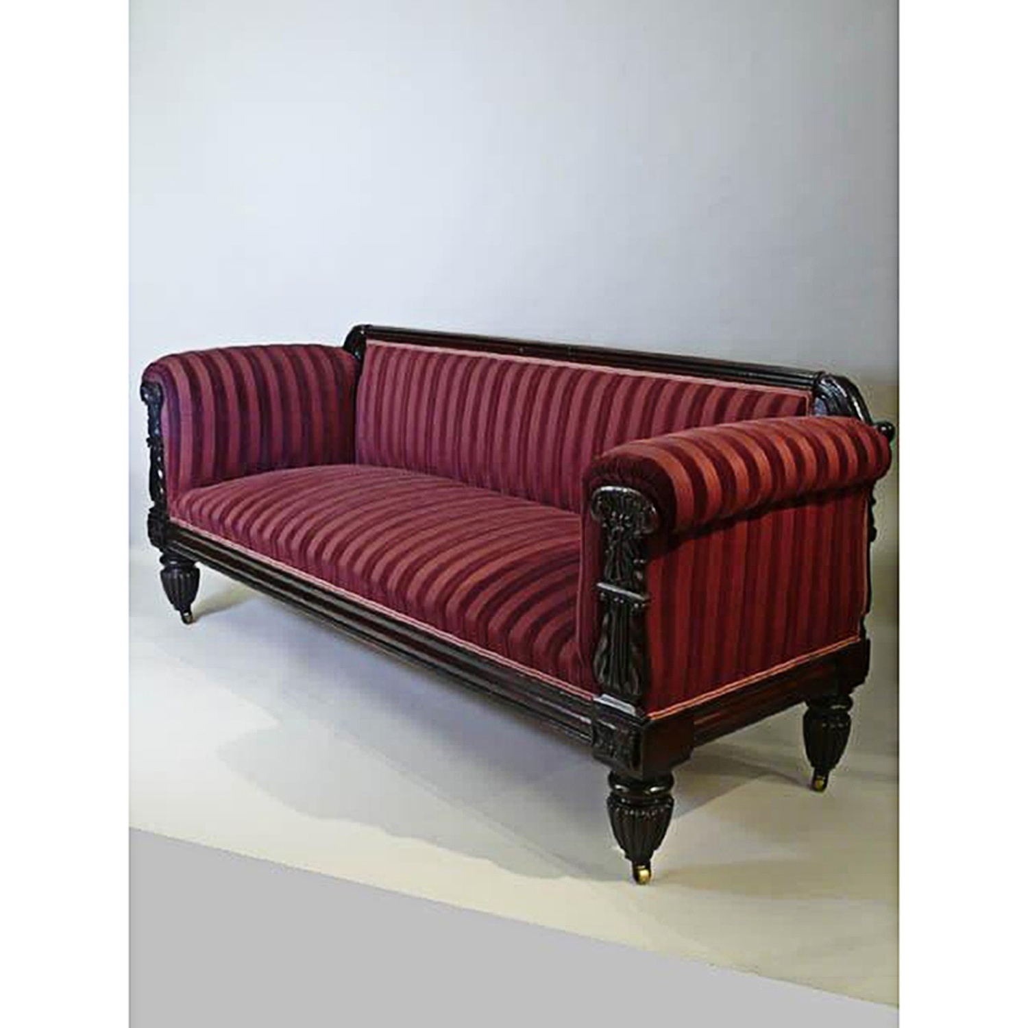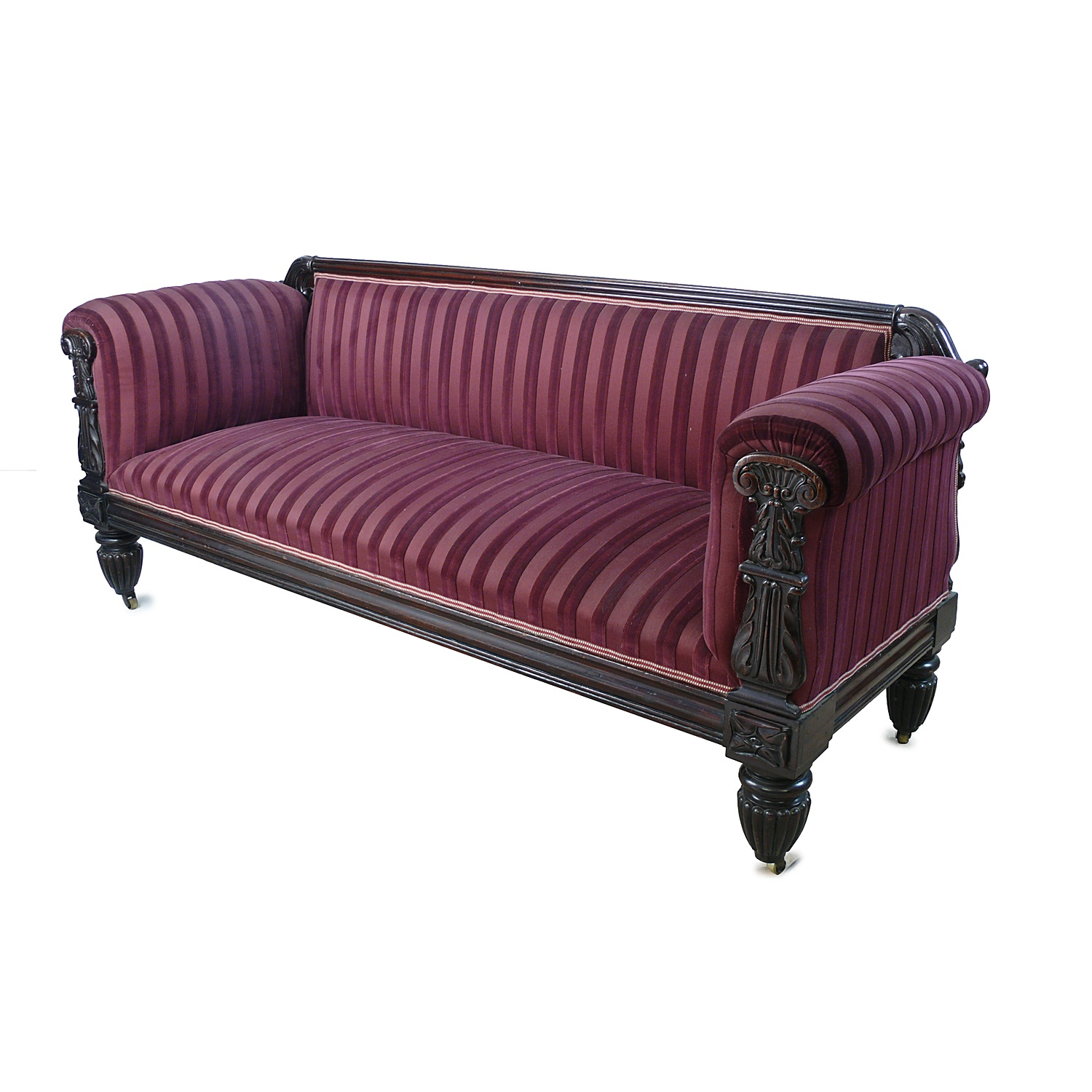 CARVED MAHOGANY SETTEE / SOFA WILLIAM IV WITH REEDED ARMS AND TAPERING LEGS ON CASTORS WITH BURGUNDY STRIPED CHENILLE UPHOLSTERY L 203 CM H 85 CM D 67 CM