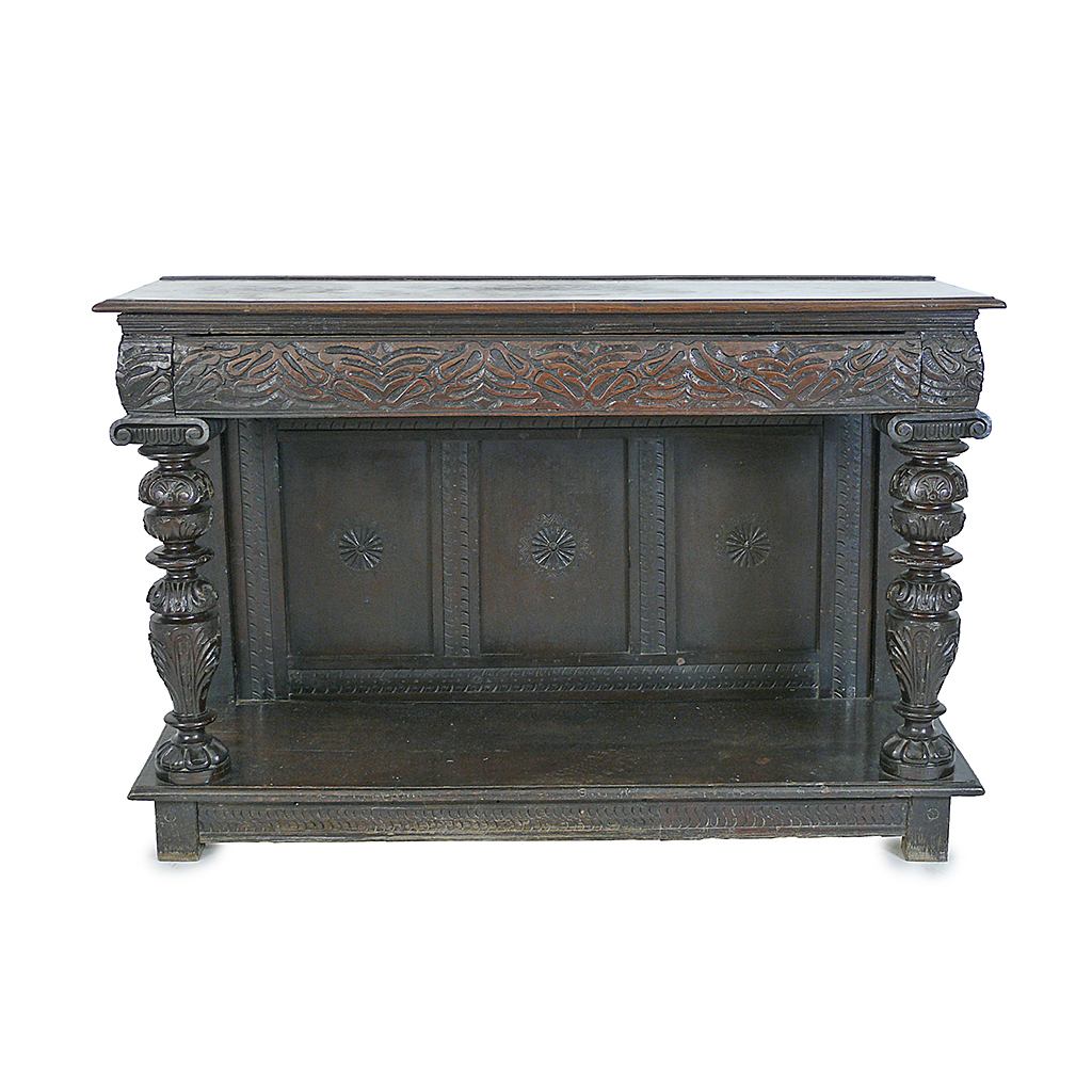 CARVED OAK BUFFET CIRCA 1650 ORNATE CARVED AND TURNED SUPPORTS WITH A SOLID THREE PANEL BACK 90 CM HIGH 137 CM WIDE 49 CM DEEP