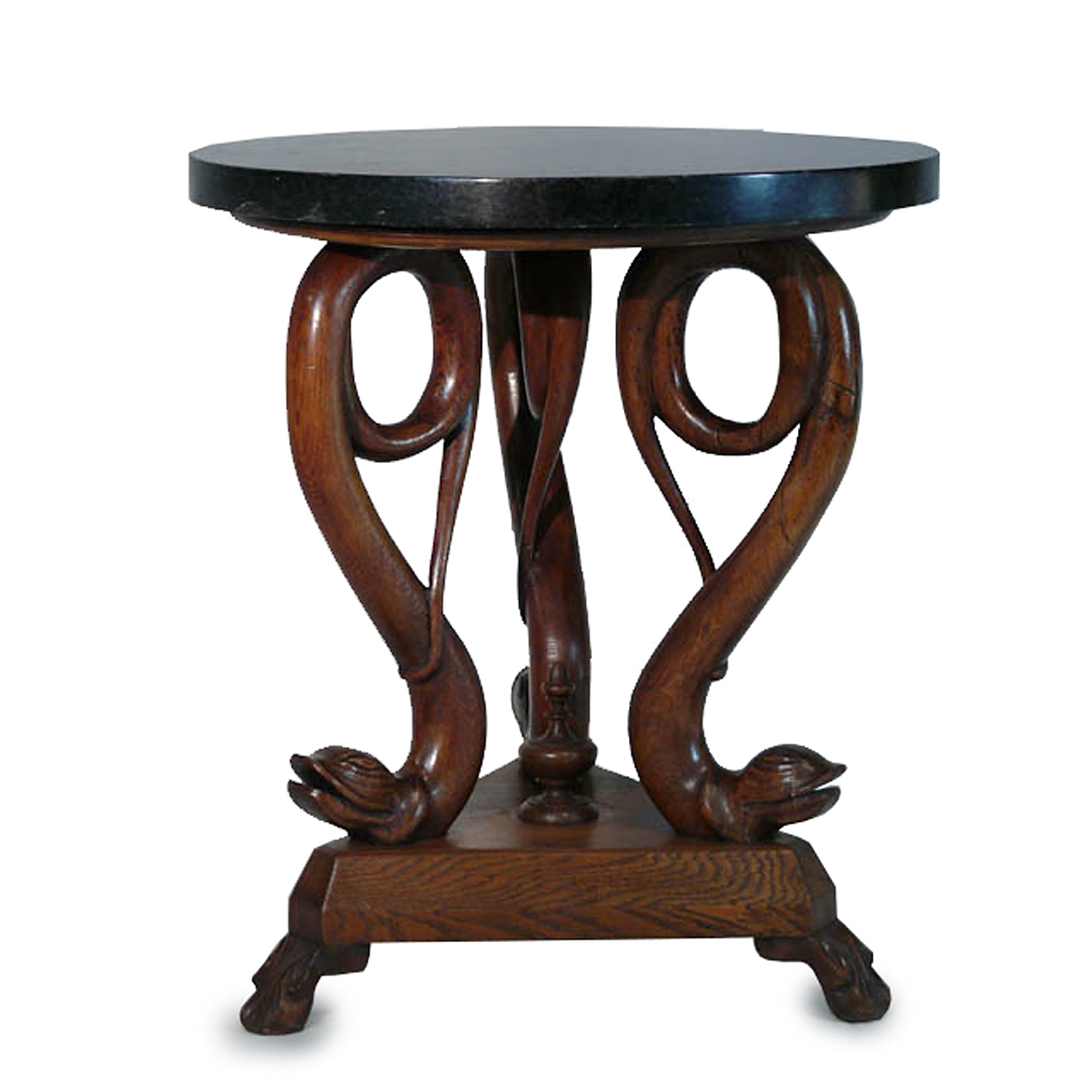 CARVED OAK SERPENT BASE TABLE DARK GREEN MARBLE TOP 75 CM HIGH X 66 CM DIAM