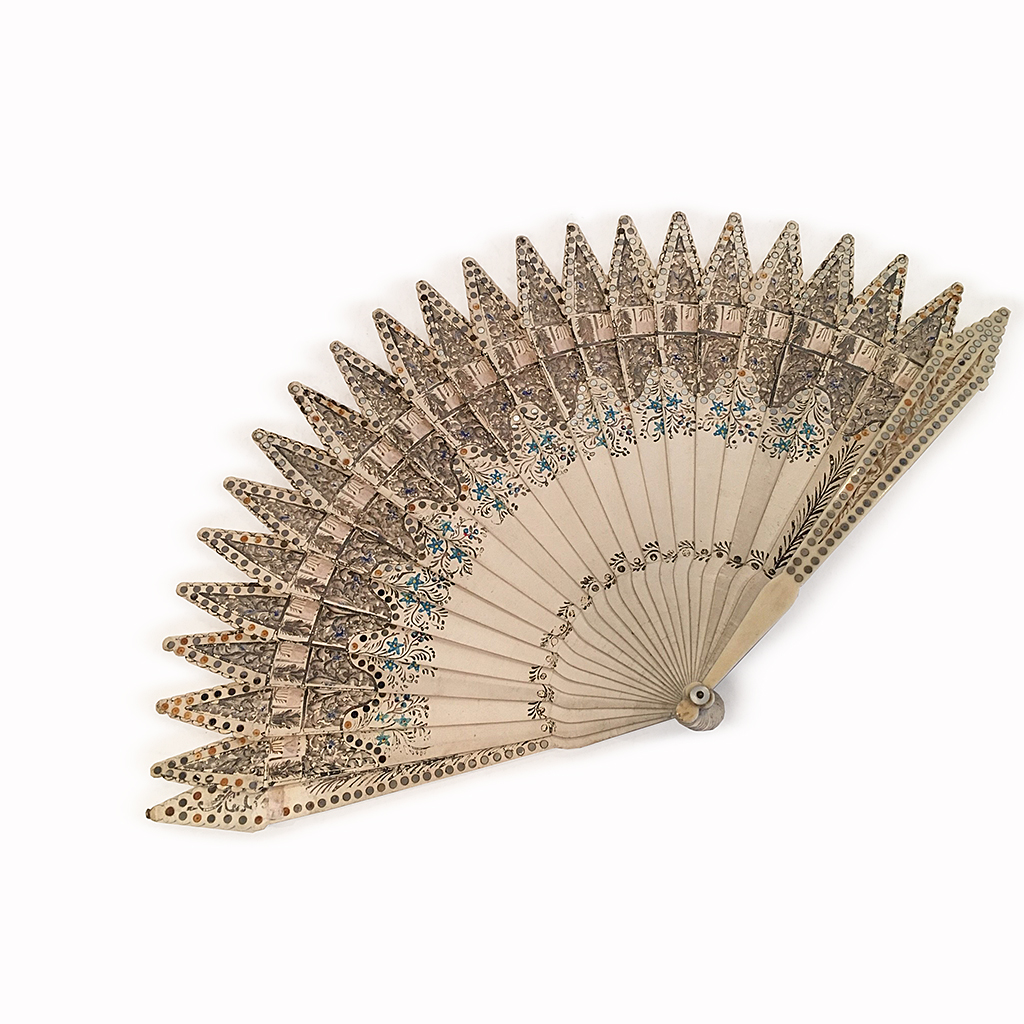 CARVED WOODEN REGENCY STYLE BRISE FAN WITH SILVER INLAY AND HAND PAINTED DETAIL WITH CARVED BONE GUARD STICKS