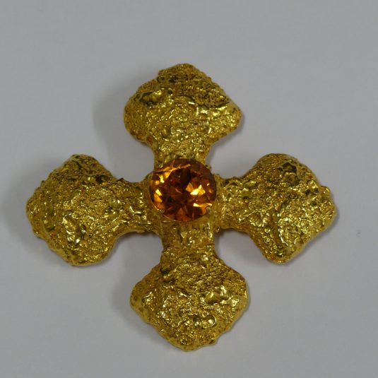 CASTLECLIFF LARGE CRUSADER CRUCIFIX / CROSS BROOCH AMERICAN 1960'S SIGNED GILT WITH AMBER COLOUR STONE