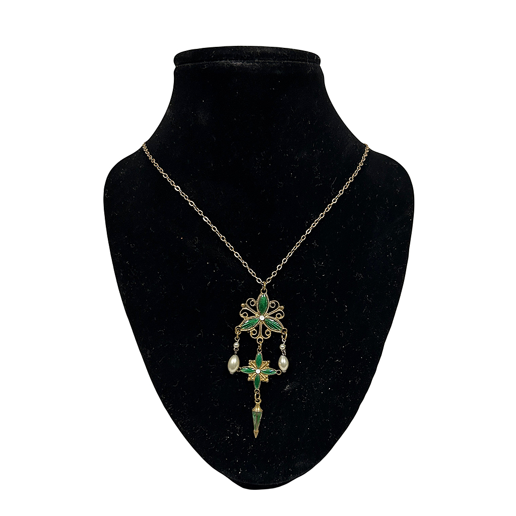 CHAIN NECKLACE WITH GREEN ENAMEL PENDANT AND PEARL DROPS