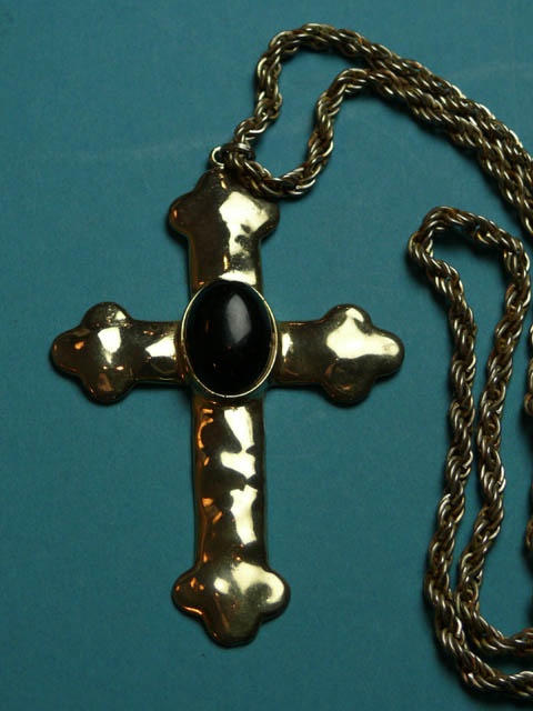 CHAIN NECKLACE WITH LARGE SILVER CRUCIFIX / CROSS WITH LARGE OVAL BLACK STONE