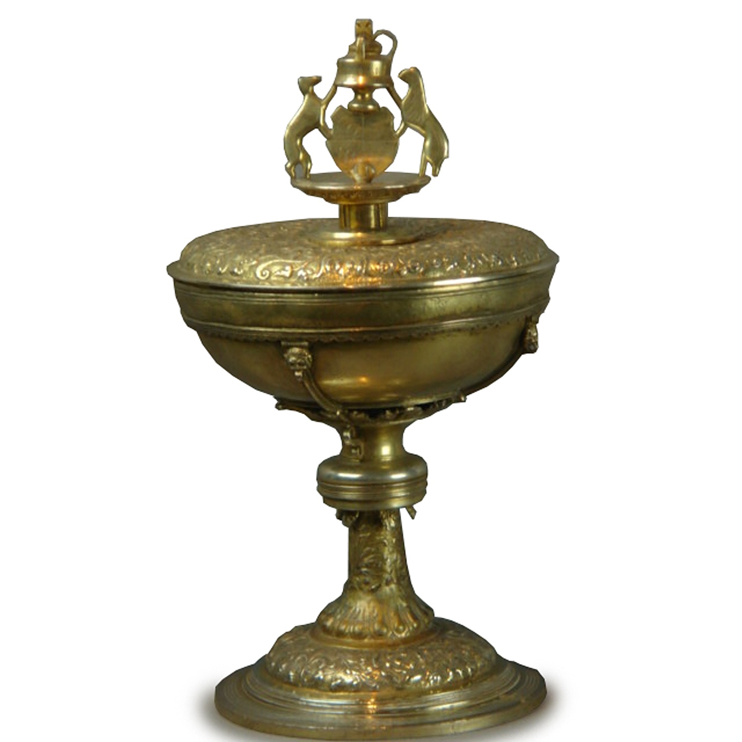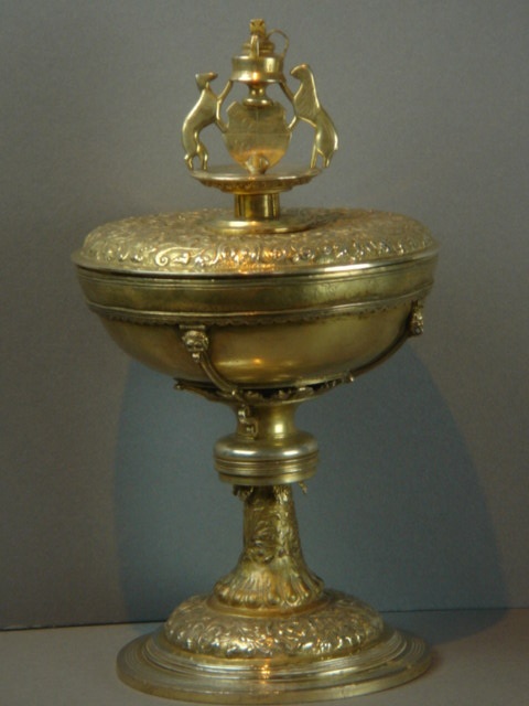 CHALICE CUP AND COVER ELKINGTON SILVER GILT BELLS MTD HERALDIC FINIAL10/i 26 CM