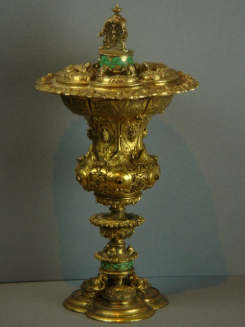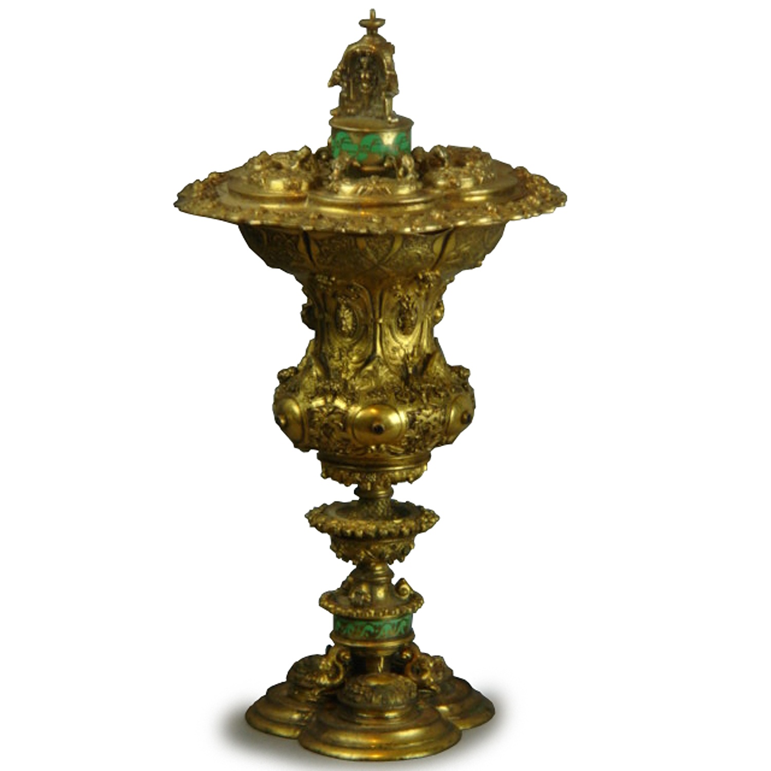 CHALICE CUP AND COVER SILVER GILT WITH GREEN ENAMEL BANDS 10/i HIGH 25 CM