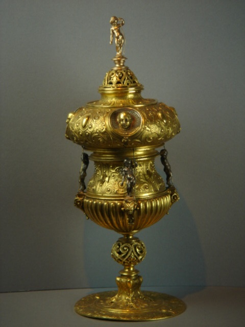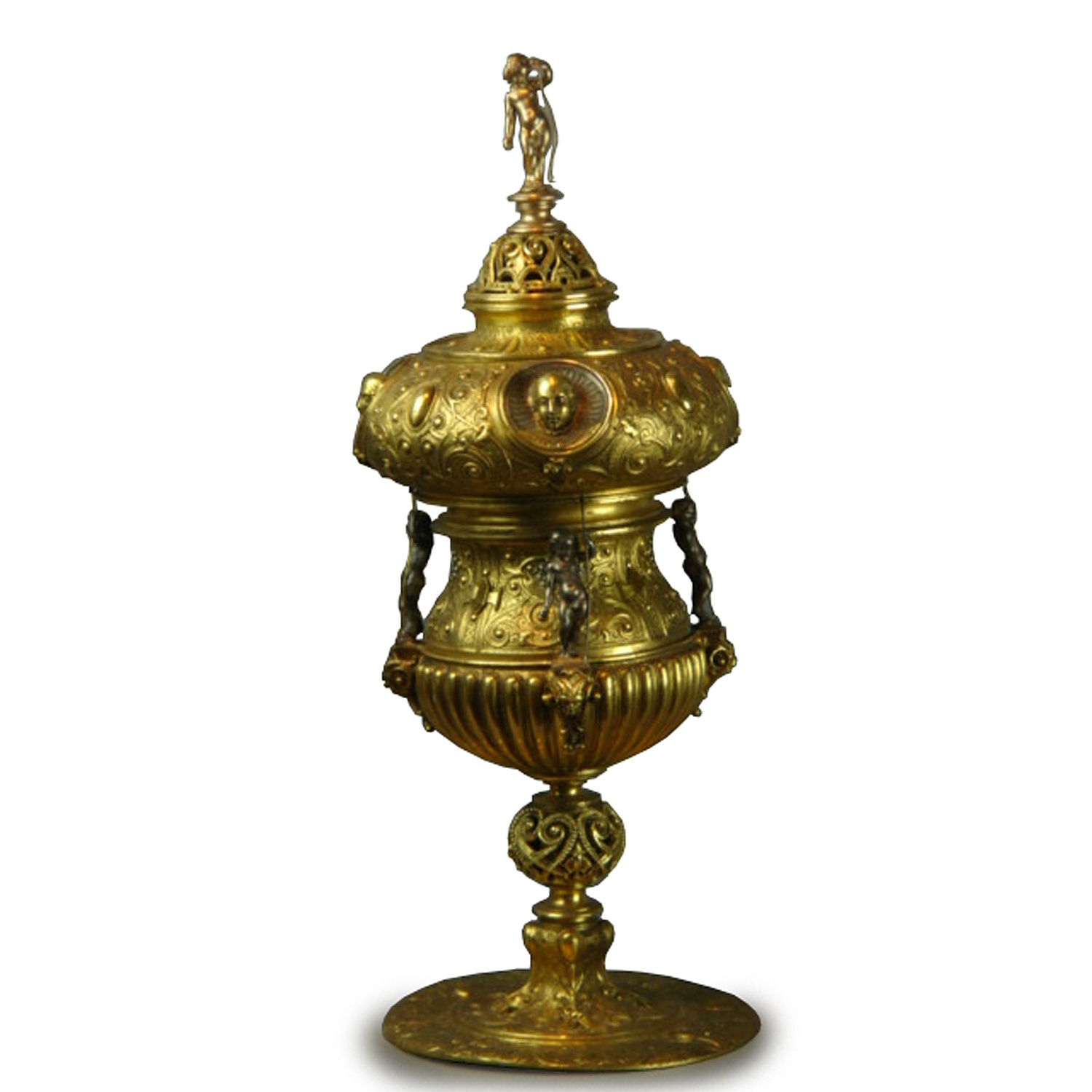 CHALICE / INCENSE VASE WITH COVER SILVER GILT CHERUB DESIGN RENAISSANCE STYLE 16/i HIGH 40 CM