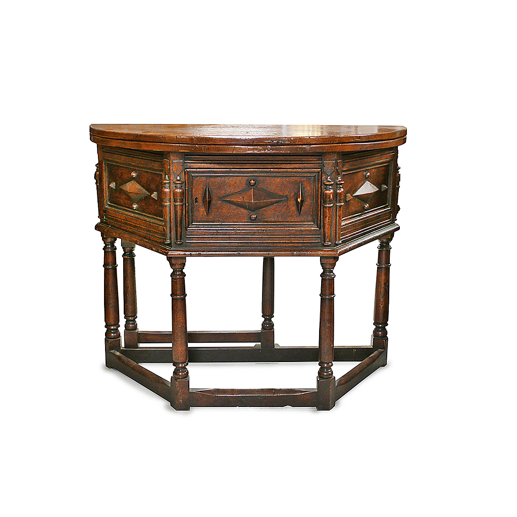 CHARLES I STYLE DEMI LUNE OAK CREDENCE TABLE FLAP TOP AND DIAMOND PANELS 49 CM LONG 49 CM DIAM 104 CM HIGH