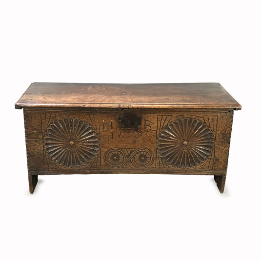 CHARLES II BOARDED OAK COFFER / CHEST WITH CARVED DAISY WHEEL FRONT DATED 1679 HB AND V CUT FEET 54 CM HIGH 118 CM WIDE 46 CM DEEP