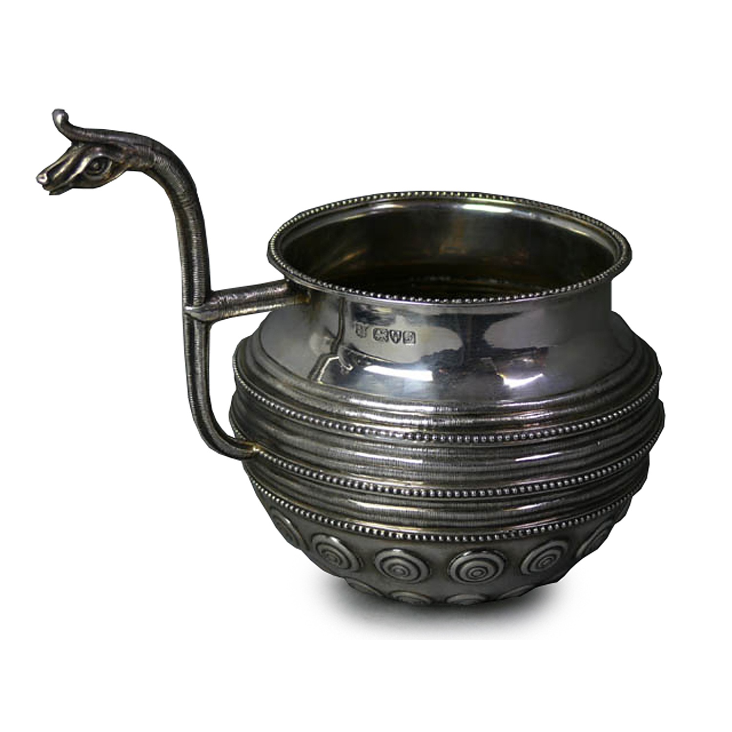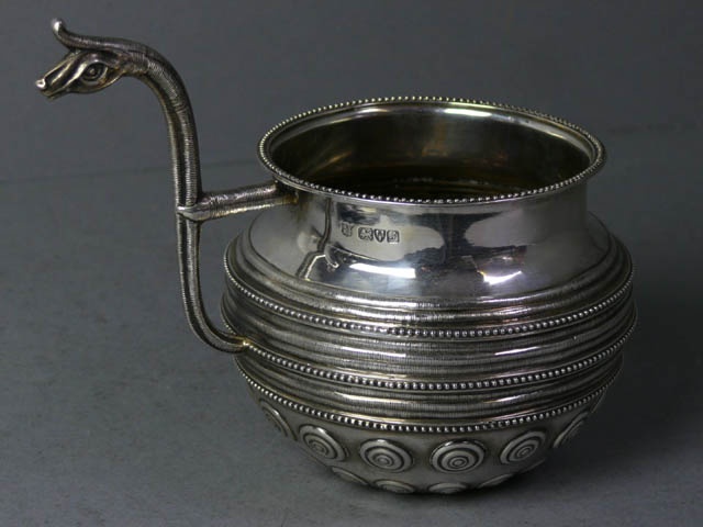 CHESTER CUP SILVER ROMAN STYLE DRINKING VESSLE WITH SERPENT HANDLE AND CIRCLE RELIF 10 CM HIGH