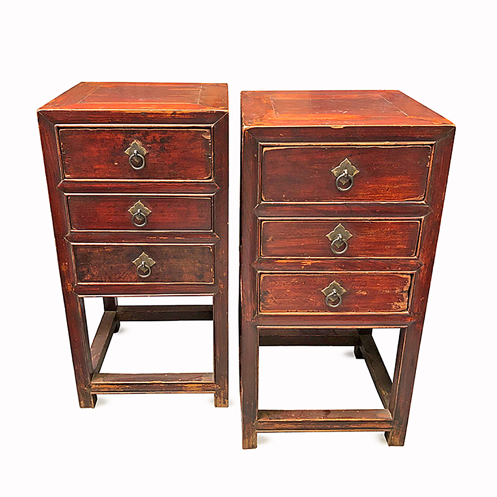 CHINESE BEDSIDE TABLE DARK WOOD WITH THREE DRAWERS 78 CM HIGH 39 CM WIDE 40 CM DEEP (X2)