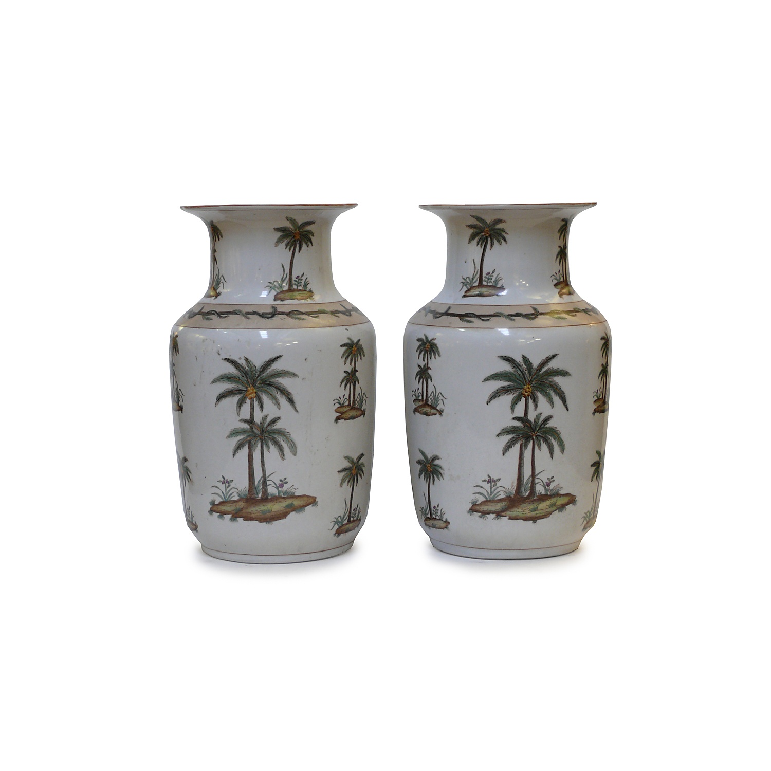 CHINESE BEIGE CERAMIC PALM TREE PATTERN VASE 14/i HIGH (X2)