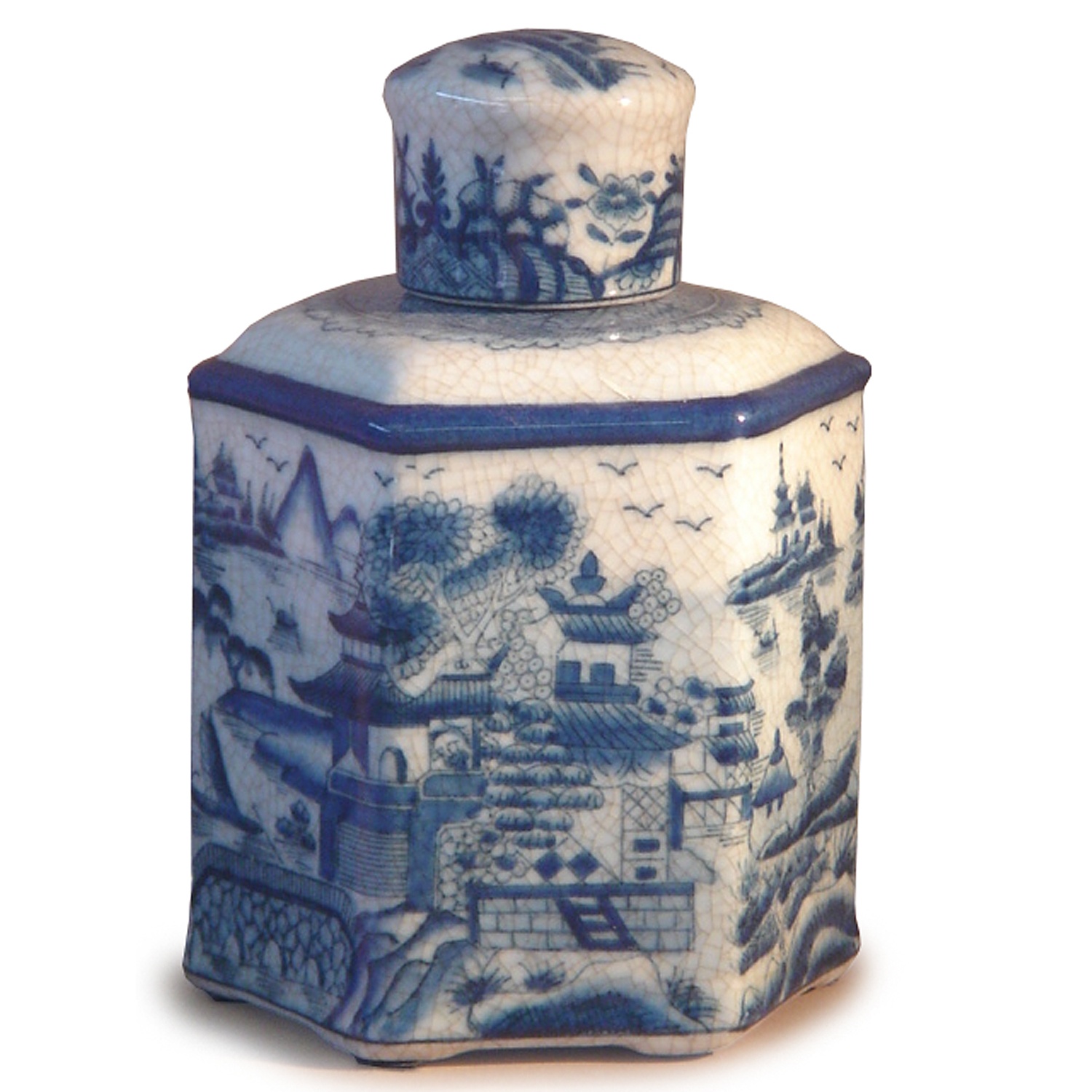 CHINESE BLUE AND WHITE SIX SIDED TEA CANISTER AND LID 7/i HIGH (X2)