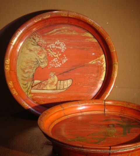 CHINESE DECORATED RED LACQUER SHALLOW FRUIT BOWL / PLATTER 14/i DIAM. 36 CM (X6)