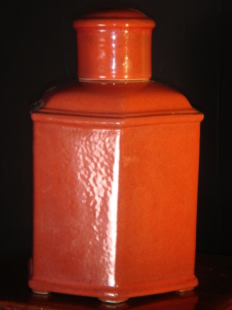 CHINESE HEXAGONAL SANG DE BOEUF CHINA CANISTER / VASE AND LID 11/i HIGH (X2)