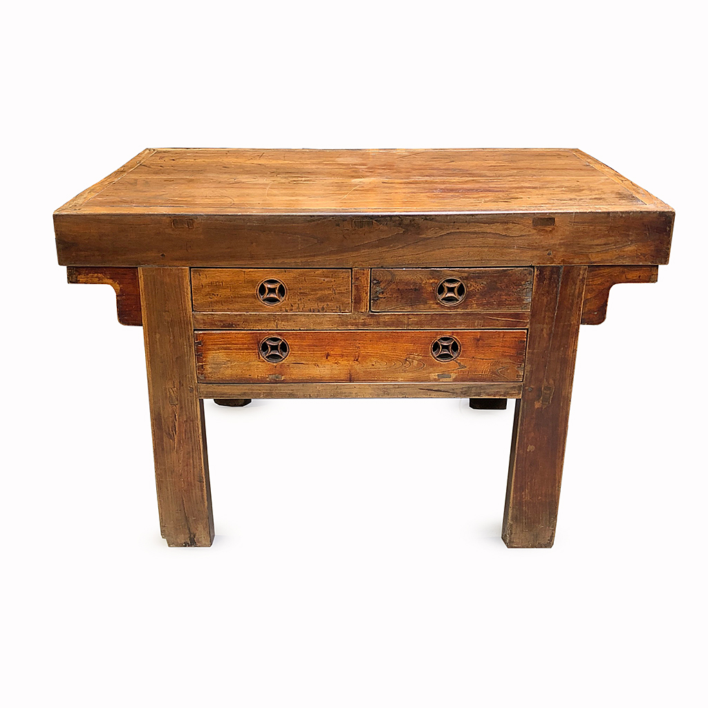 CHINESE JUMU WOOD BUTCHERS TABLE WITH THICK TOP AND SMALL FRETS TO FRONT PANEL 81 CM HIGH 125 CM WIDE 79 CM DEEP