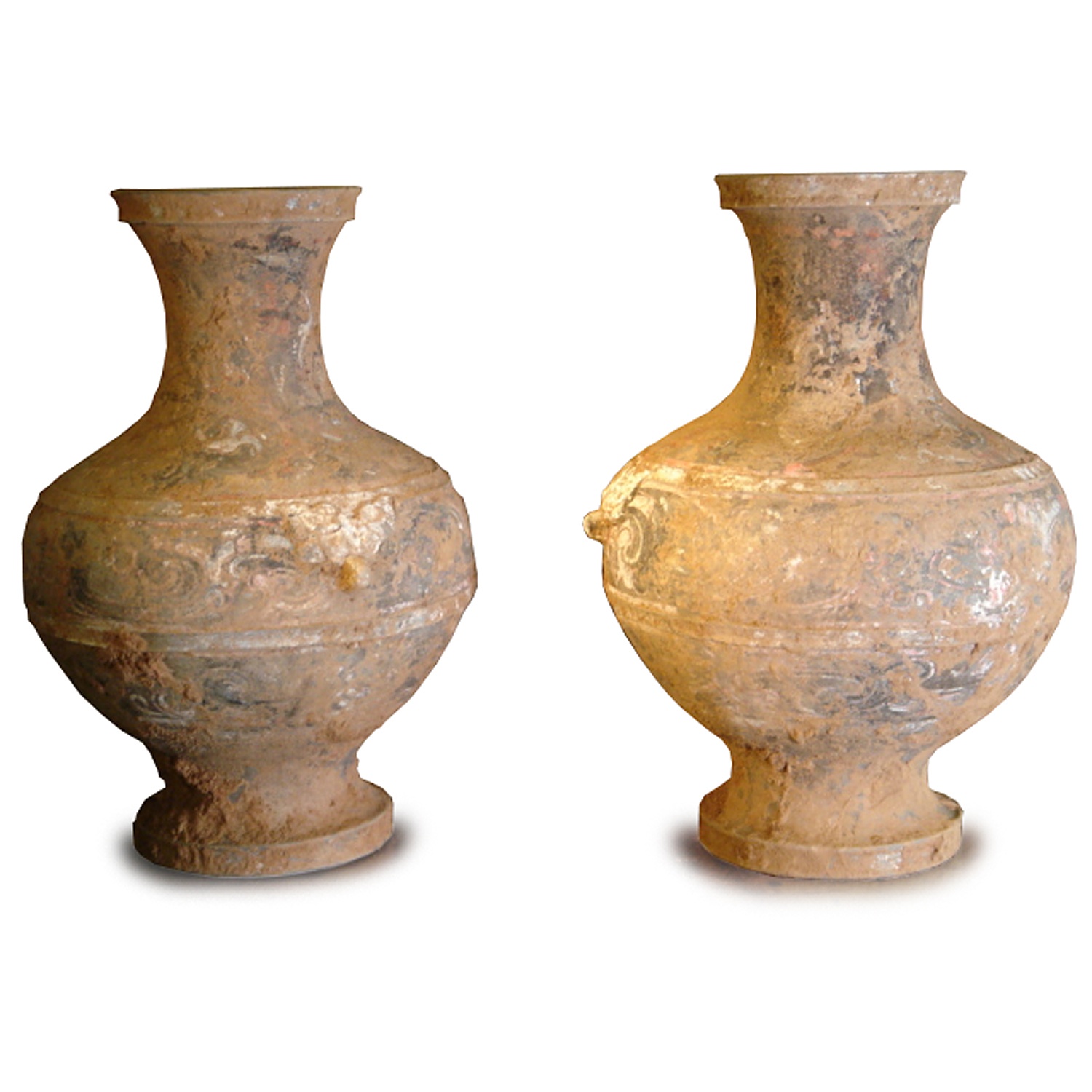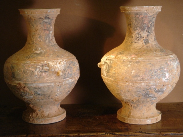 CHINESE LARGE HAN VASE BLACK AND WHITE DECORATED CERAMIC 19/i 48 CM (X2) 206 BC - 220 AD (X2)