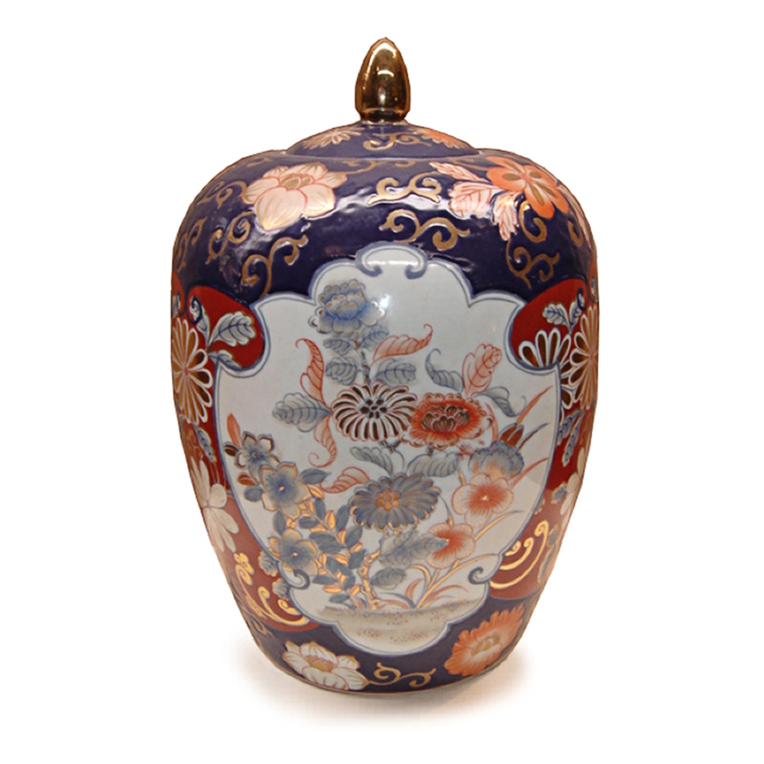 CHINESE NAVY AND ORANGE FLORAL CHINA MEDIUM VASE AND LID 14/i HIGH (X2)
