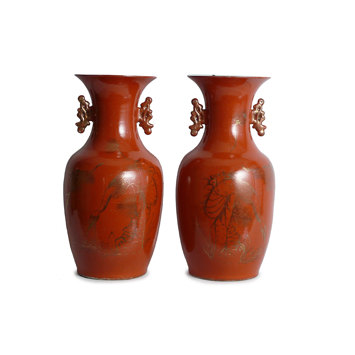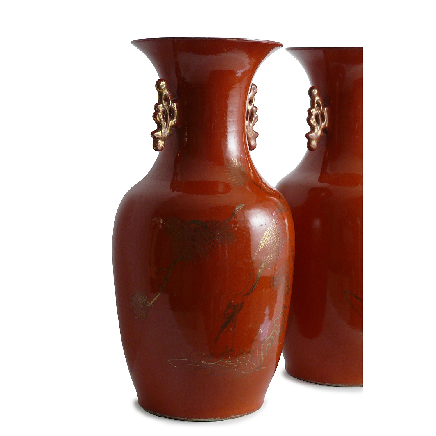 CHINESE ORANGE GLAZE BALUSTER VASE WITH FAINT GILT DECORATION 20TH CENT. 45 CM HIGH (X2)