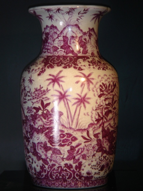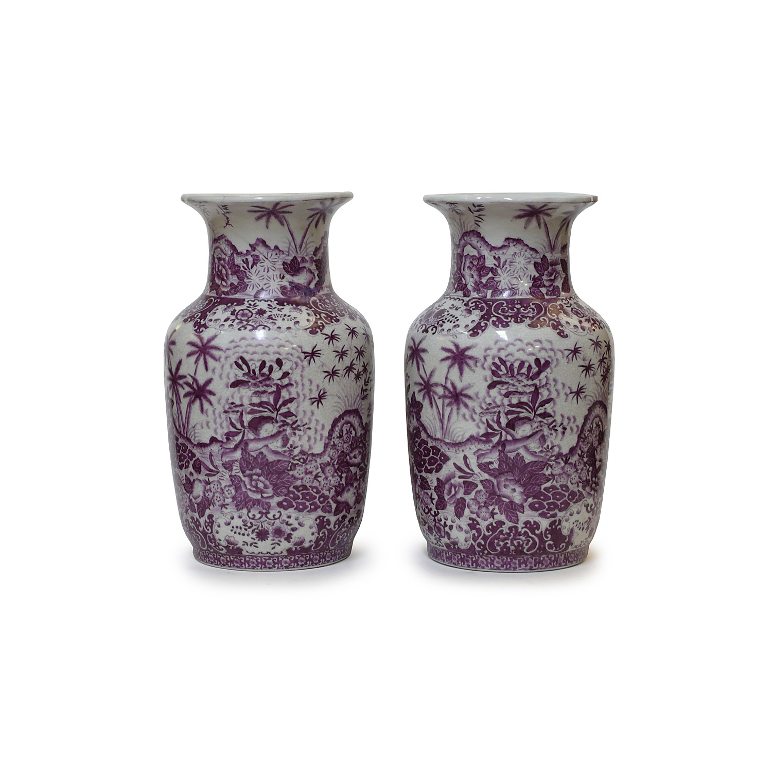 CHINESE ORNATE PALM PATTERN VASE PURPLE AND CREAM 14/i HIGH (X2)