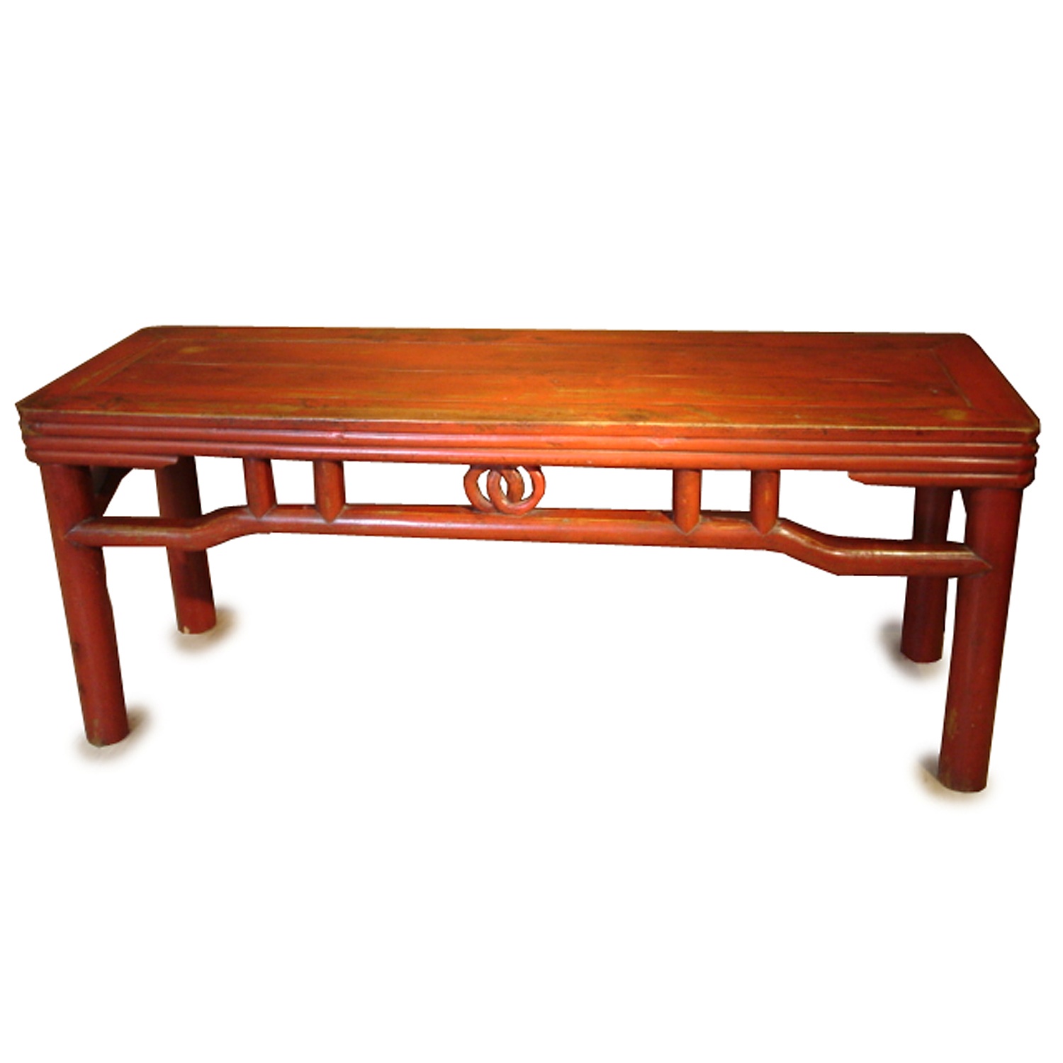 CHINESE RED LACQUER LOW COFFEE TABLE WITH ROUND LEGS 44 CM HIGH 110 CM LONG 36 CM WIDE