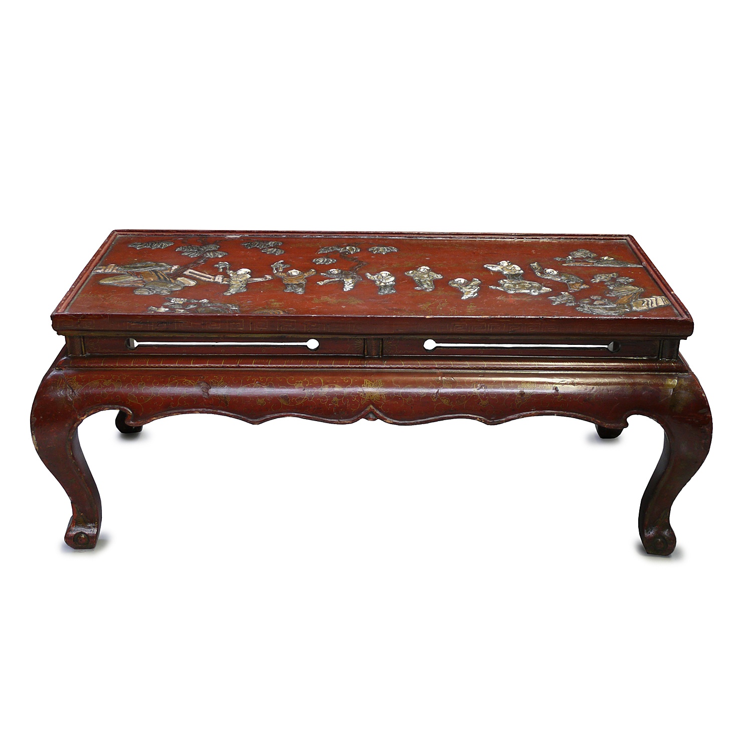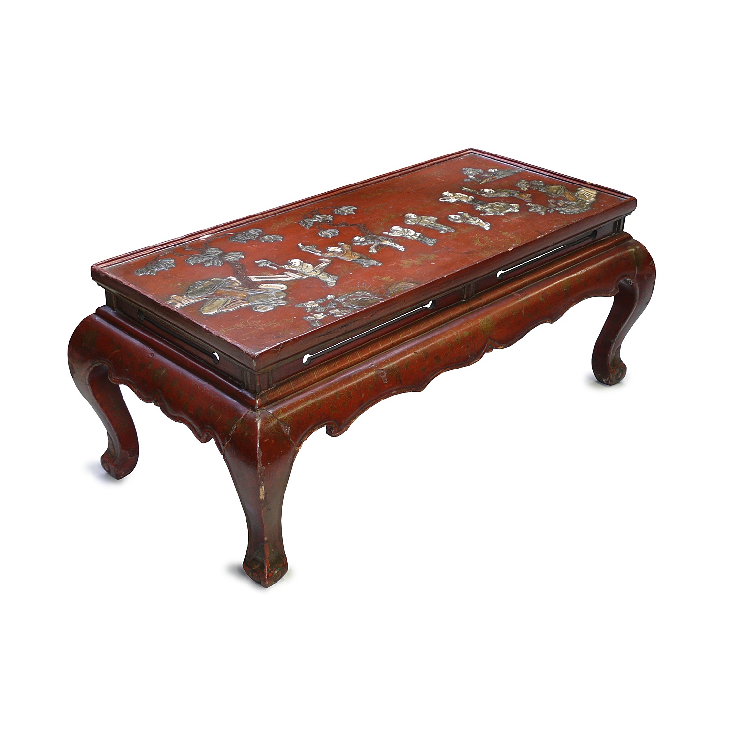 CHINESE RUST RED LACQUER COFFEE TABLE FAUX IVORY RELIEF TOP 42 CM HIGH 104 CM LONG 52 CM DEEP
