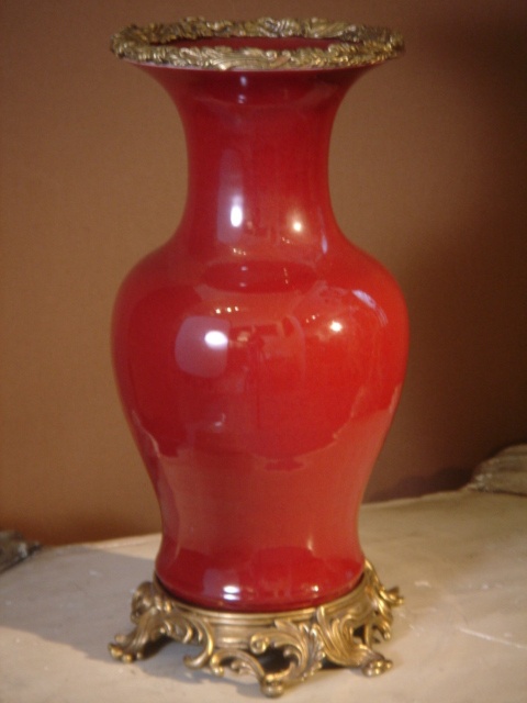 CHINESE SANG DE BOEUF VASE WITH FRENCH ORMOLU RIM AND BASE MOUNTS 16/i HIGH