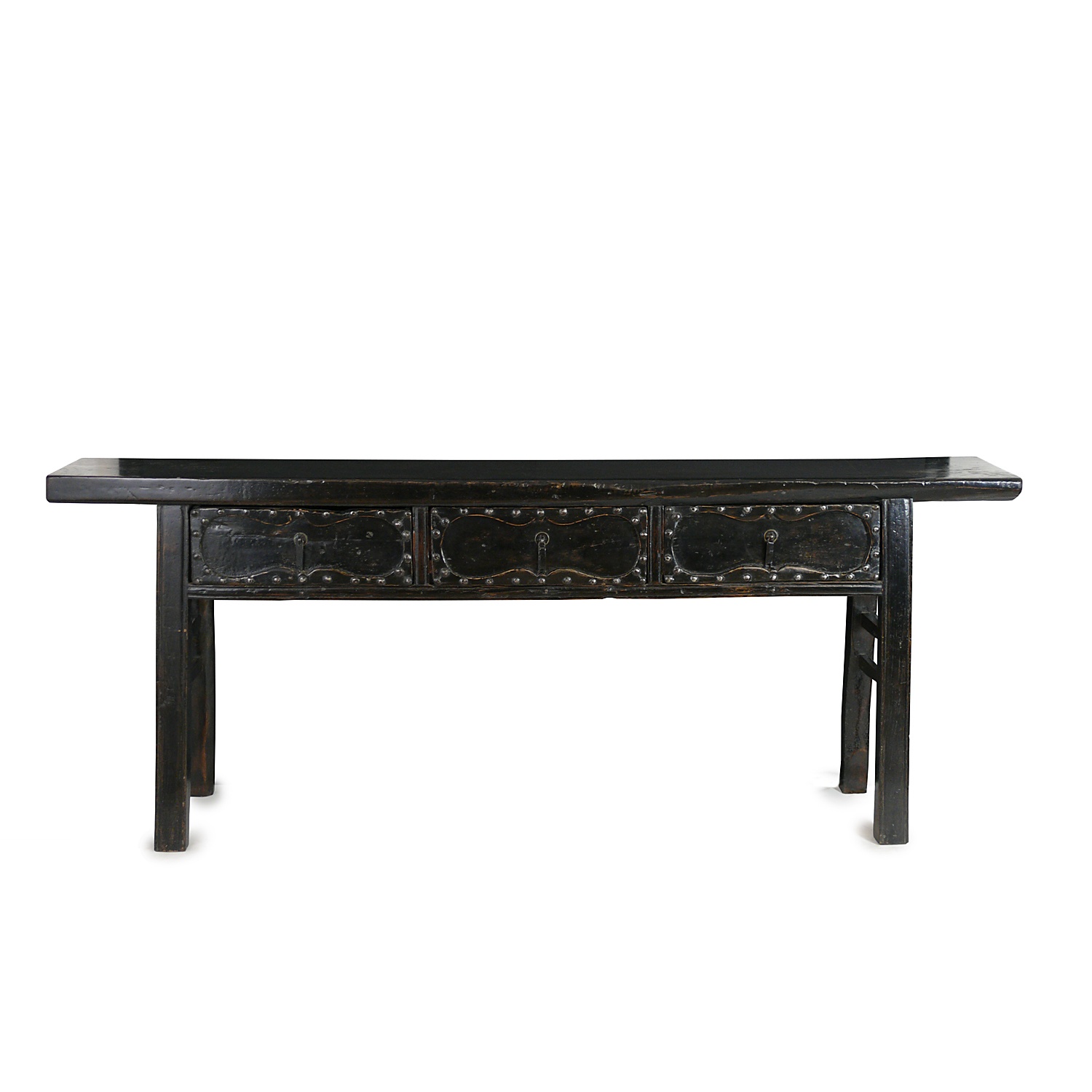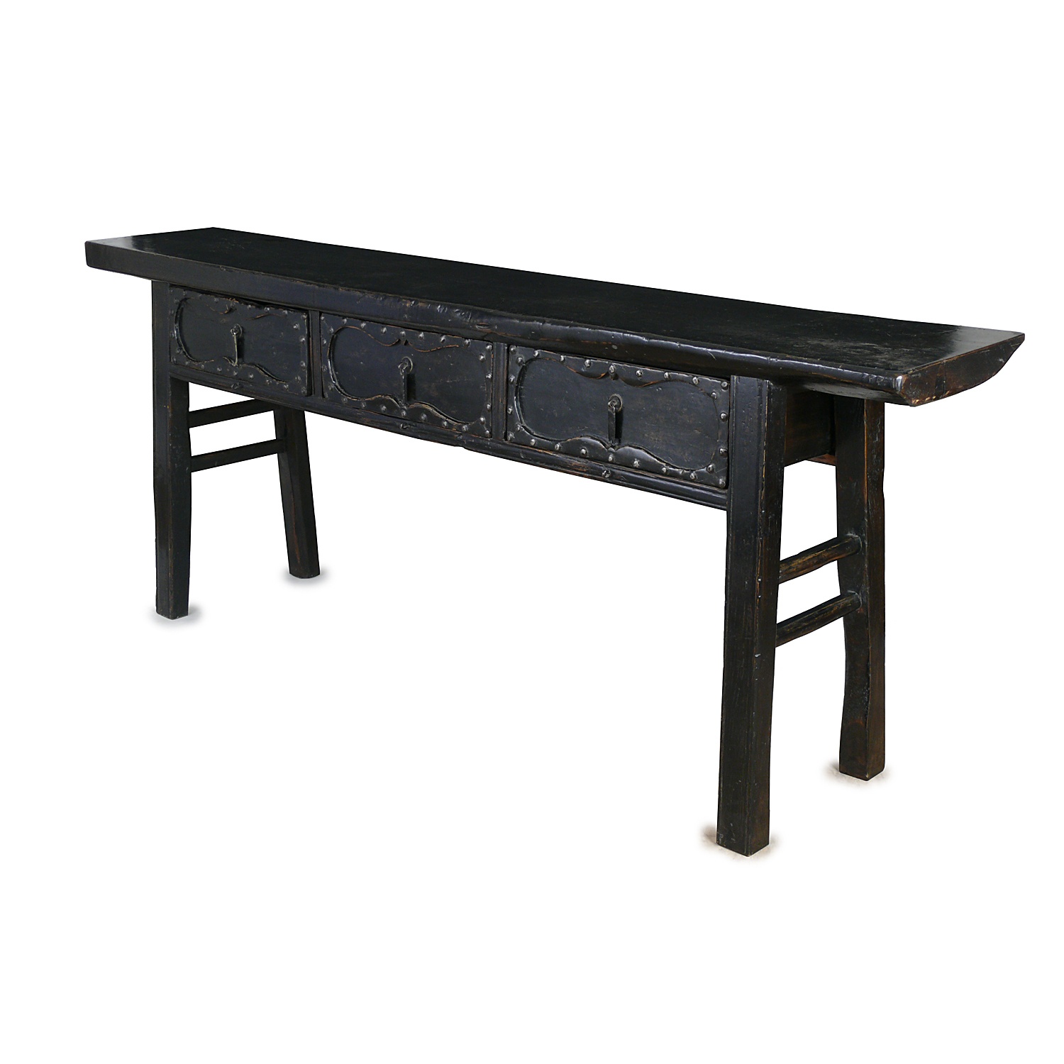 CHINESE SHANXI NARROW BLACK SIDE TABLE THREE STUDDED DRAWERS EARLY 18TH CENT. 80 CM HIGH 204 CM LONG 35 CM DEEP