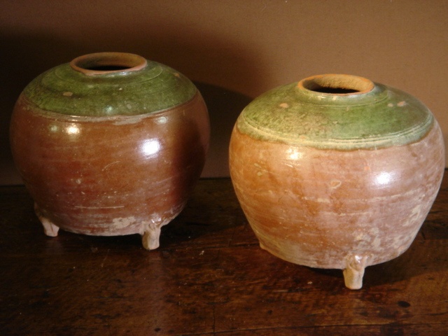 CHINESE SMALL HAN DYNASTY VASE GREEN GLAZED TOP HALF ON THREE FEET 206 BC - 220 AD 7/i 18 CM (X2)