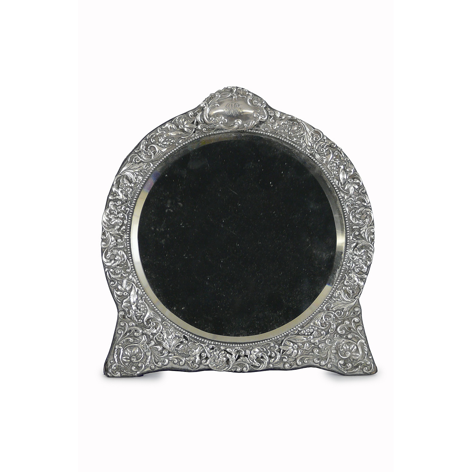 CIRCULAR BEVELLED GLASS TOILET MIRROR ON STAND WITH ORNATE FLORAL EMBOSSED FRAME AND MONOGRAM