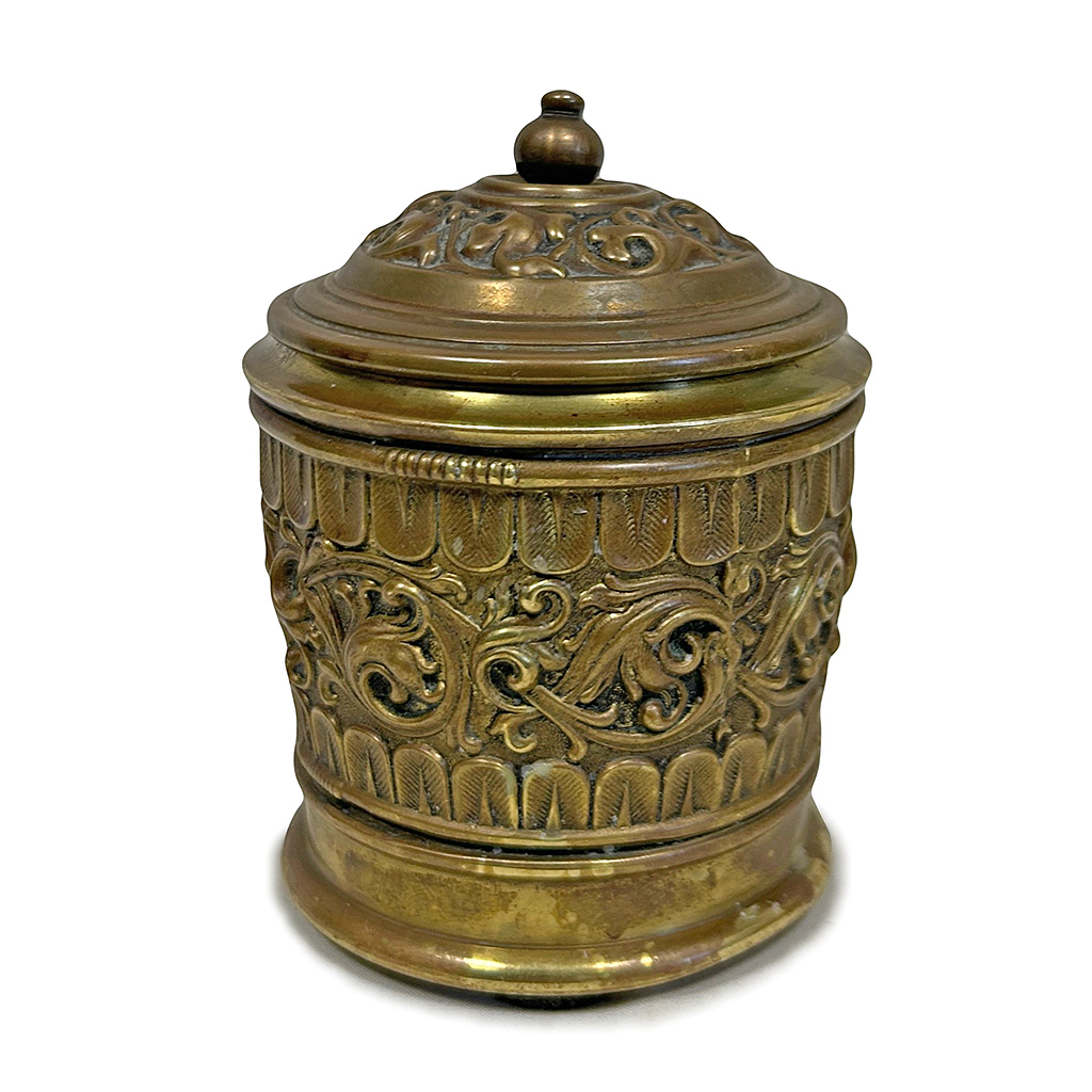CIRCULAR BRASS BOX WITH LID AND ORNATE FLORAL RELIEF 11 CM HIGH / 9 CM DIAMETER