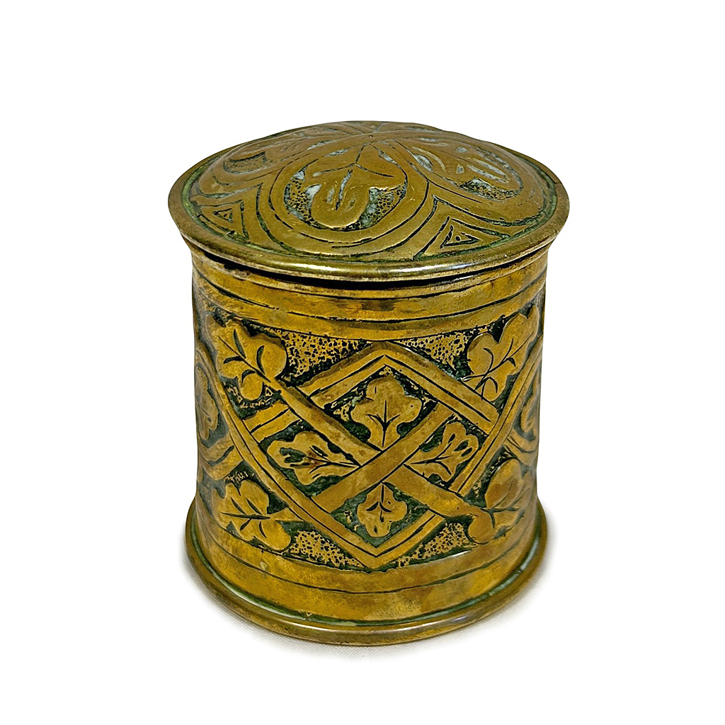 CIRCULAR BRASS BOX WITH ORNATE RELIEF AND ENGRAVED DECORATION AND LID