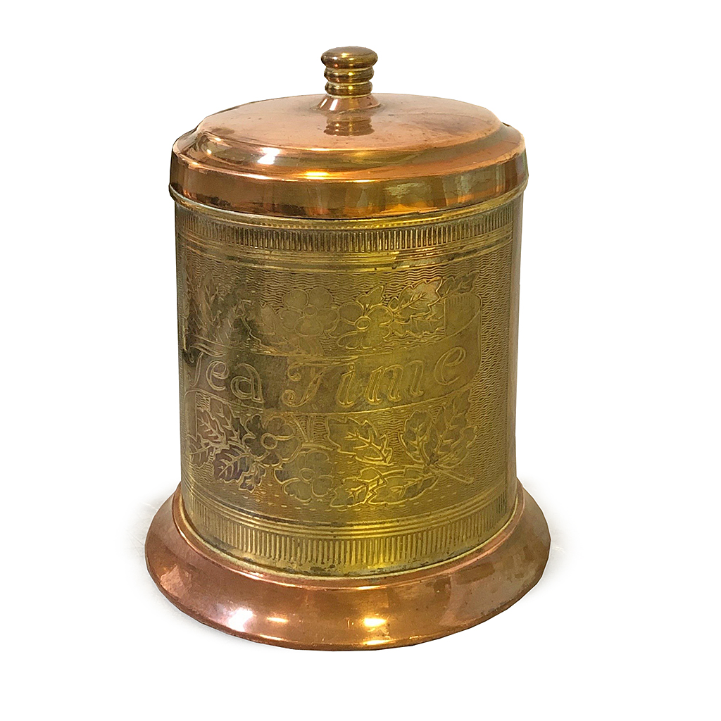 CIRCULAR BRASS BOX WITHCOPPER LID AND BANDS TOP AND BOTTOM ENGRAVED TEA TIME 13 CM HIGH