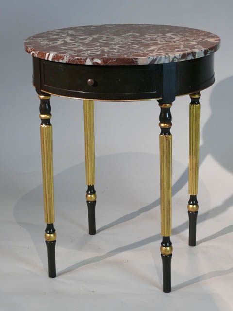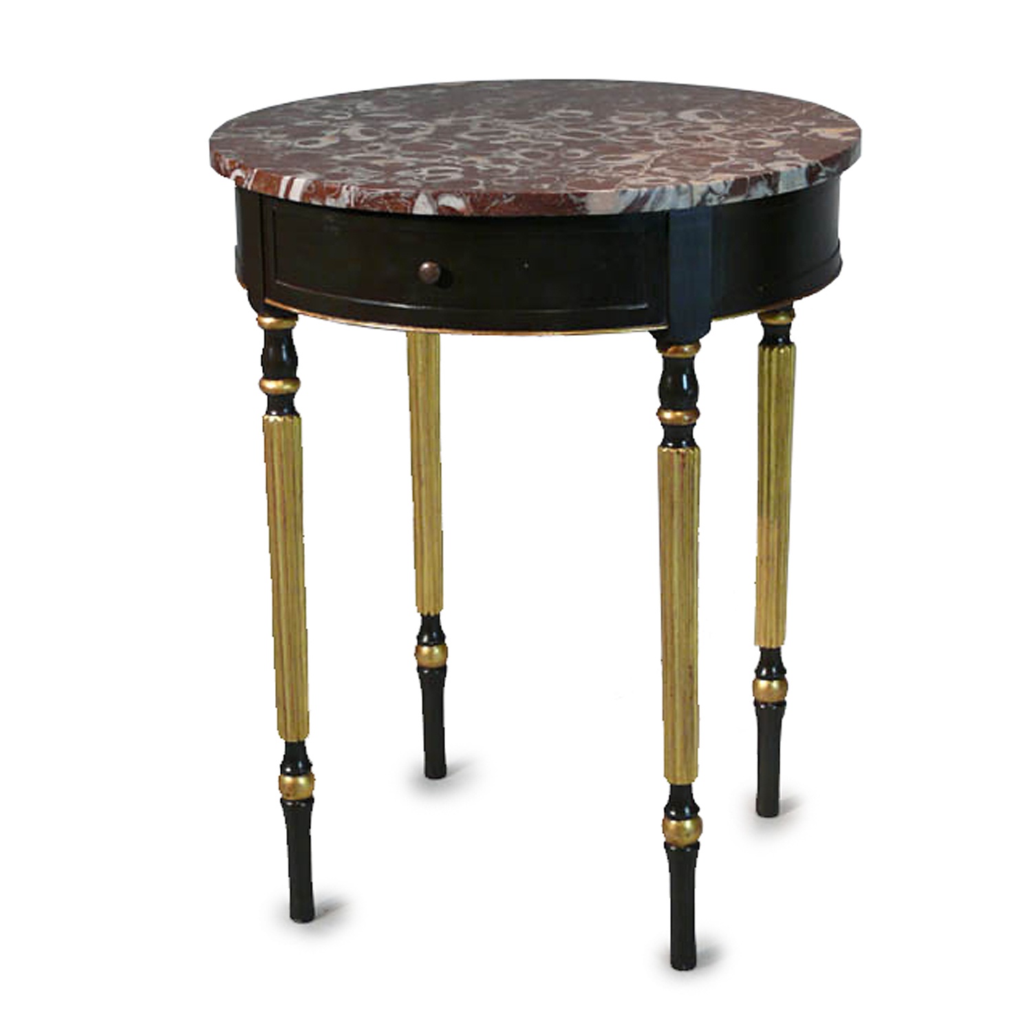 CIRCULAR FAUX BRONZE OCCASIONAL TABLE WITH GILDED LEGS AND A BROWN FOSSIL MARBLE TOP 76 CM HIGH X 61 CM DIAM (X2)