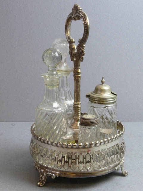 CIRCULAR FOUR PIECE CRUET SET E.P. SILVER ORNATE HANDLE BEAD EDGE WITH CUT GLASS BOTTLES