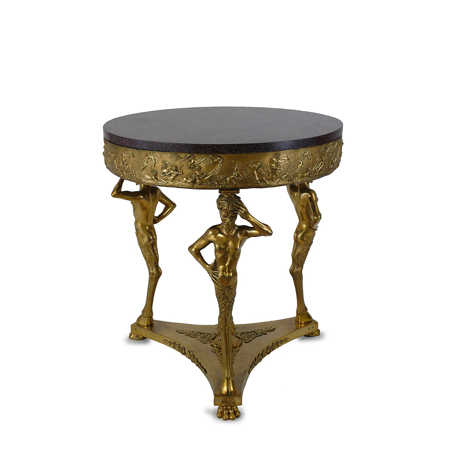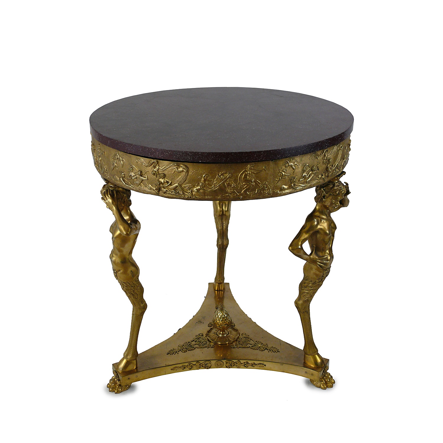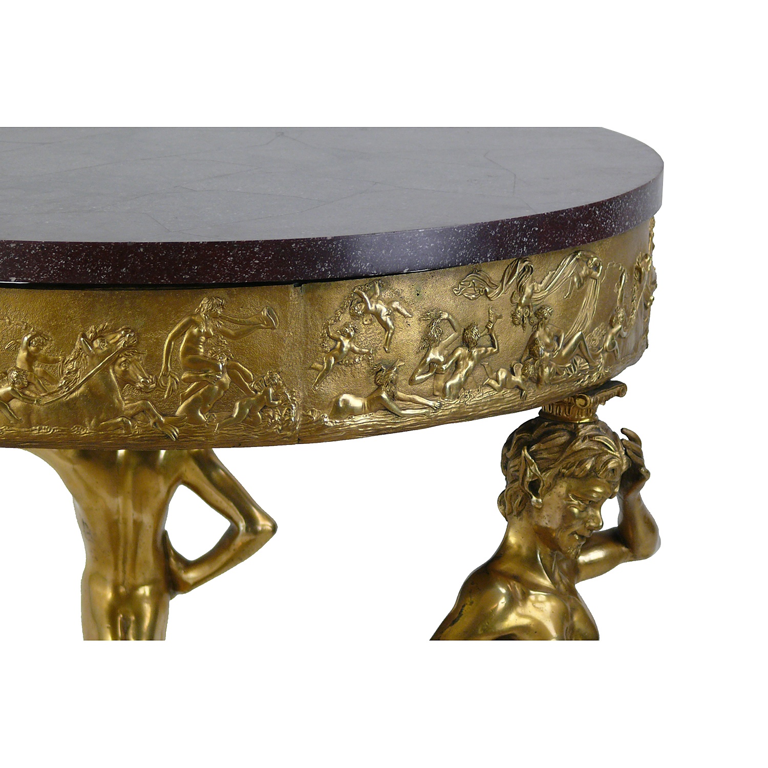 CIRCULAR GILT BRONZE TABLE WITH PORPHYRY MARBLE TOP GRAND TOUR PIECE THE FRIEZE DEPICTING SCENES OF ANTIQUITY ITALIAN NAPLES CIRCA 1850 81 CM HIGH 74 CM DIAM