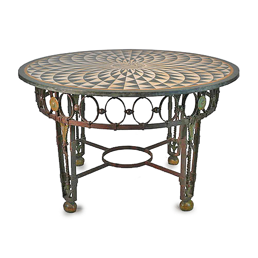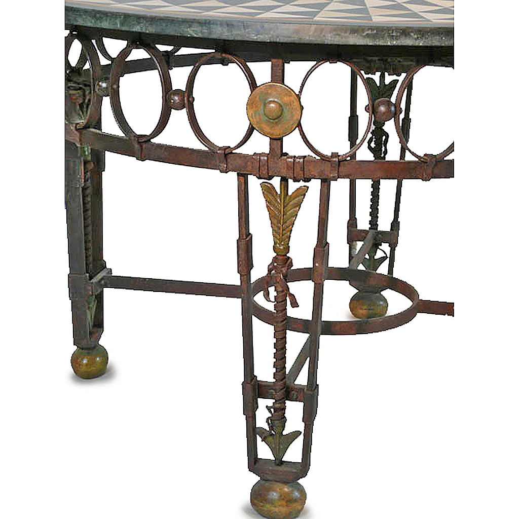 CIRCULAR GREEN AND WHITE MARBLE CENTRE TABLE RADIATING CHEQUERED DESIGN ON ORNATE WROUGHT IRON ROMAN BASE 122 CM DIAM. IN THE MANNER OF FRANCESCO SIBILIO