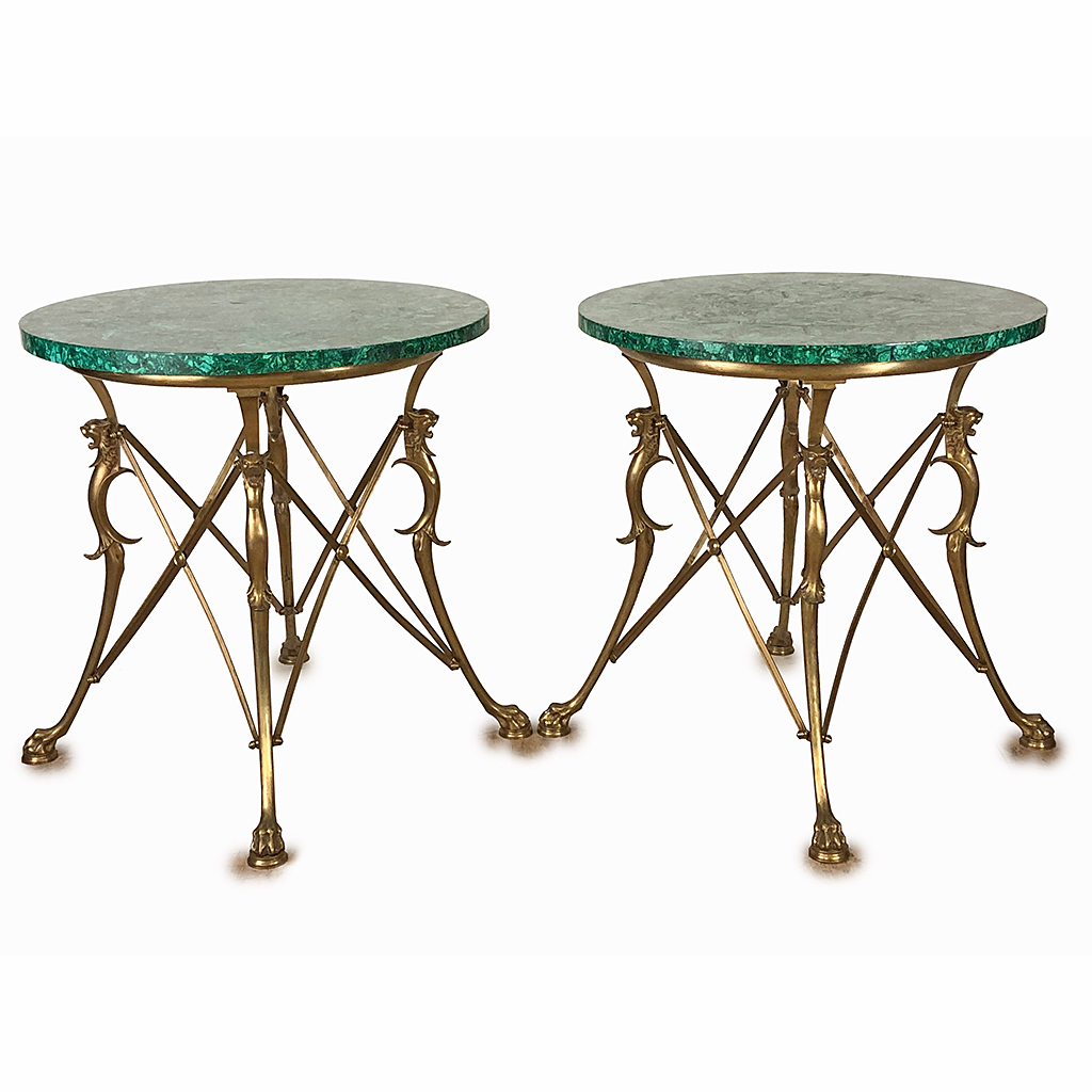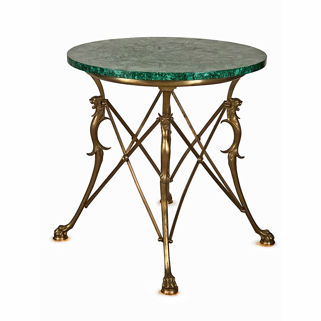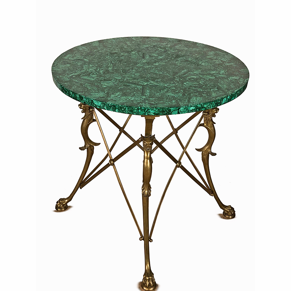 CIRCULAR GREEN MALACHITE OCCASIONAL TABLE ON CLASSICAL BRASS X FRAMED BASE 83 CM HIGH 80 CM DIAM